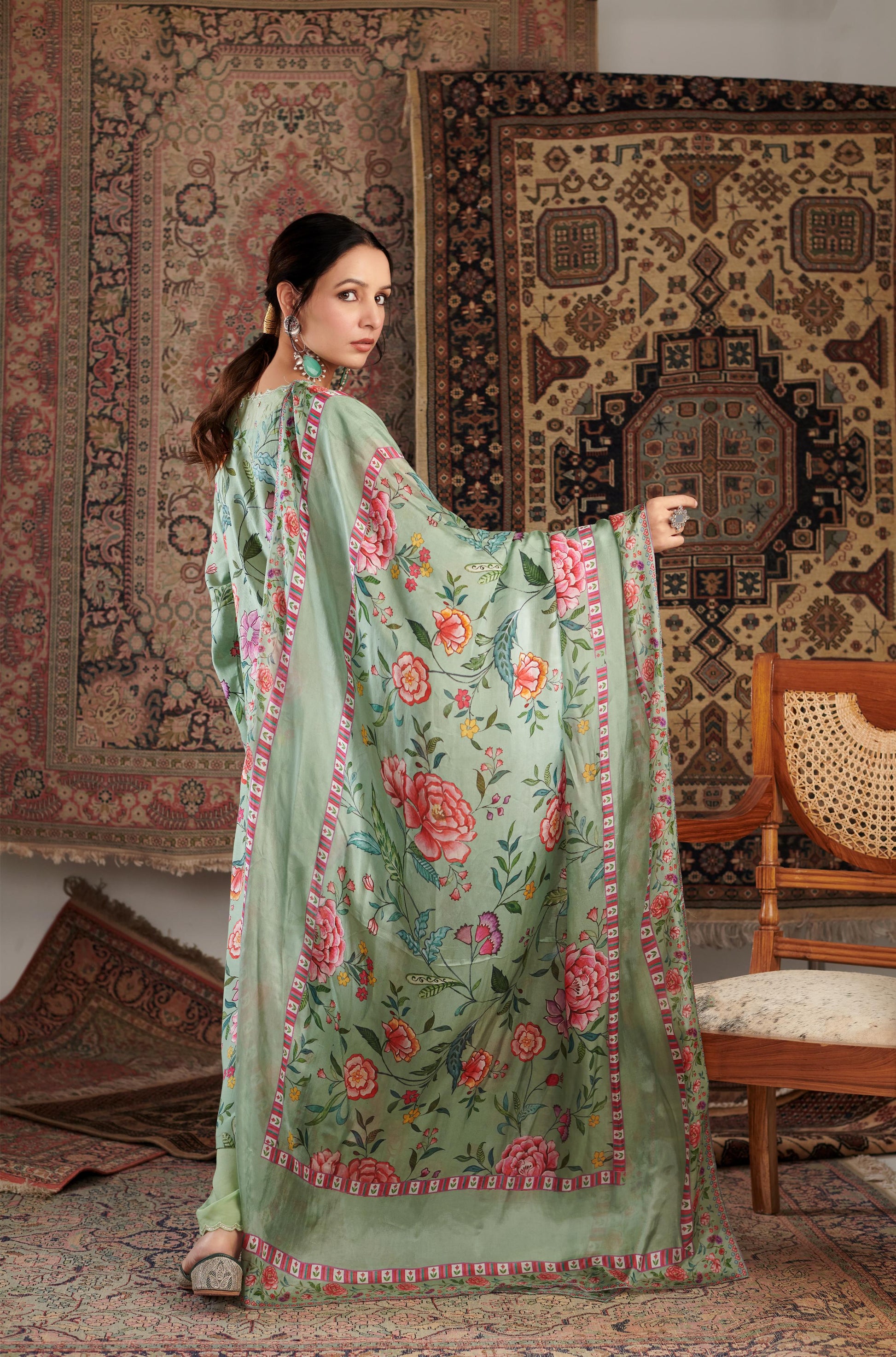 Expertly crafted from luxurious cotton silk, the AKS MINT GREEN KURTA SET is adorned with intricate hand embroidery on flattering V-neckline. Paired with scalloped edge cotton silk pants and a digital printed silk dupatta, this set exudes elegance and sophistication. Elevate your wardrobe with this versatile and stylish ensemble.