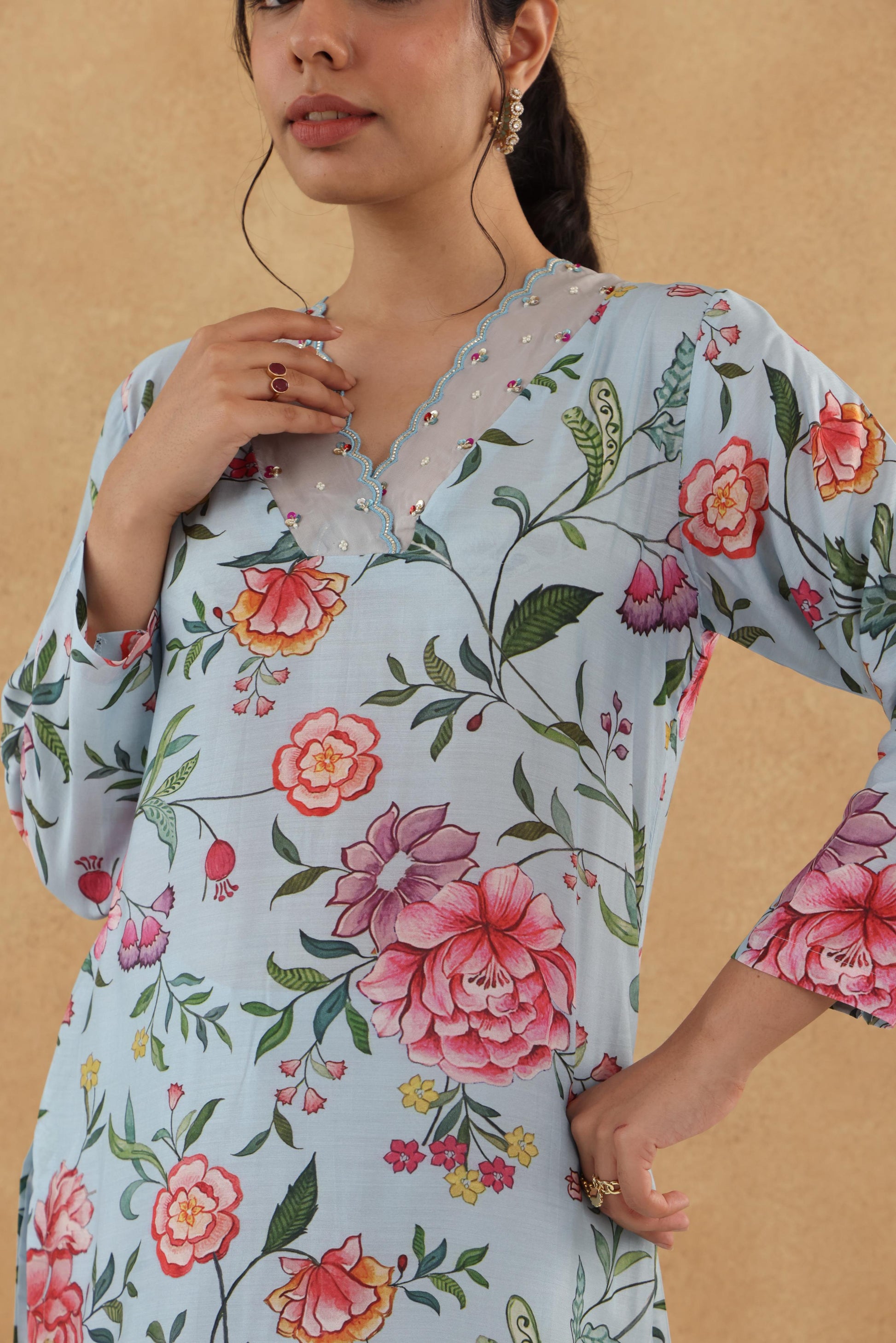 Expertly crafted from luxurious cotton silk, the AKS SKY BLUE KURTA SET is adorned with intricate hand embroidery on flattering V-neckline. Paired with scalloped edge cotton silk pants and a digital printed silk dupatta, this set exudes elegance and sophistication. Elevate your wardrobe with this versatile and stylish ensemble.