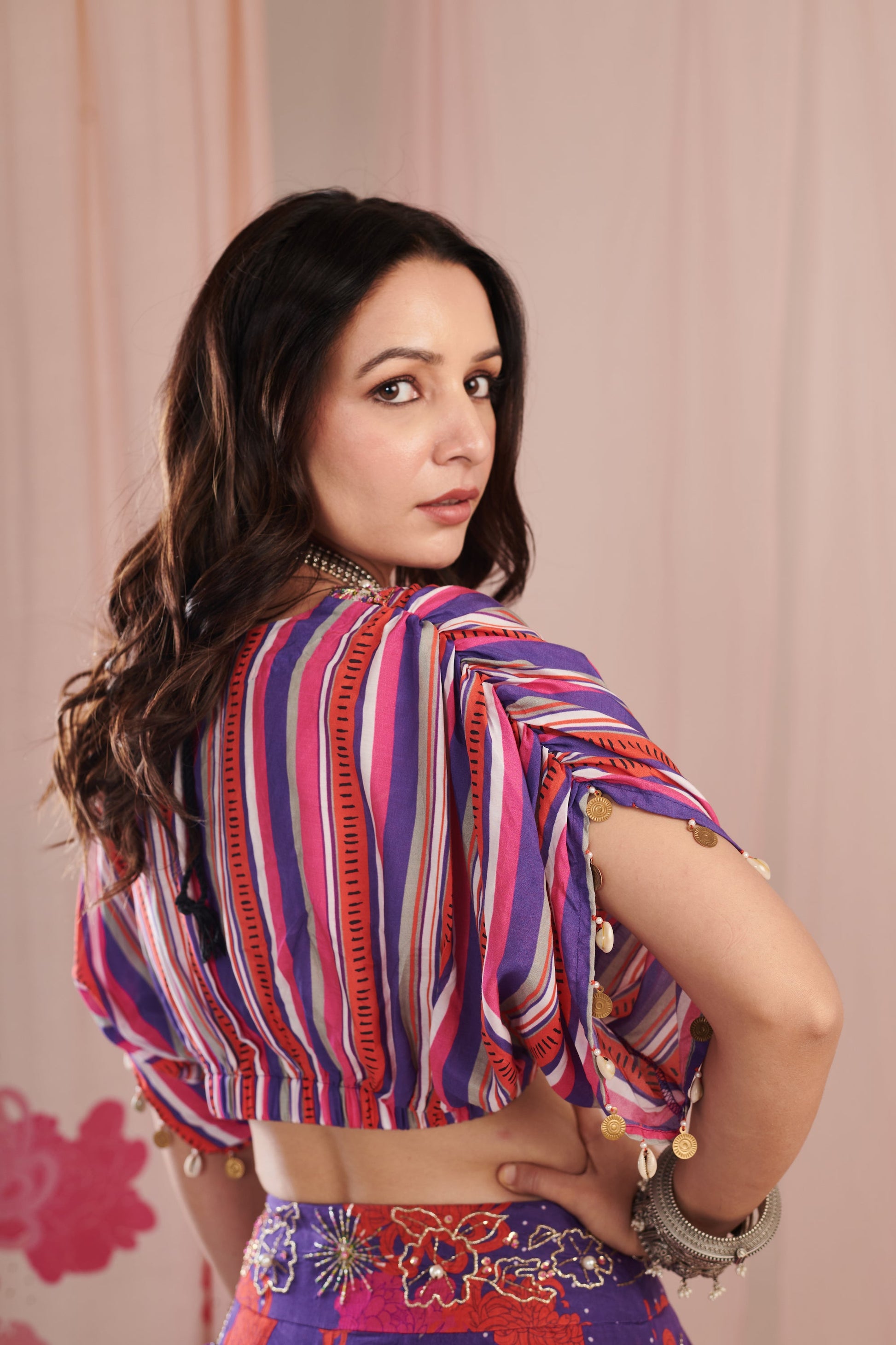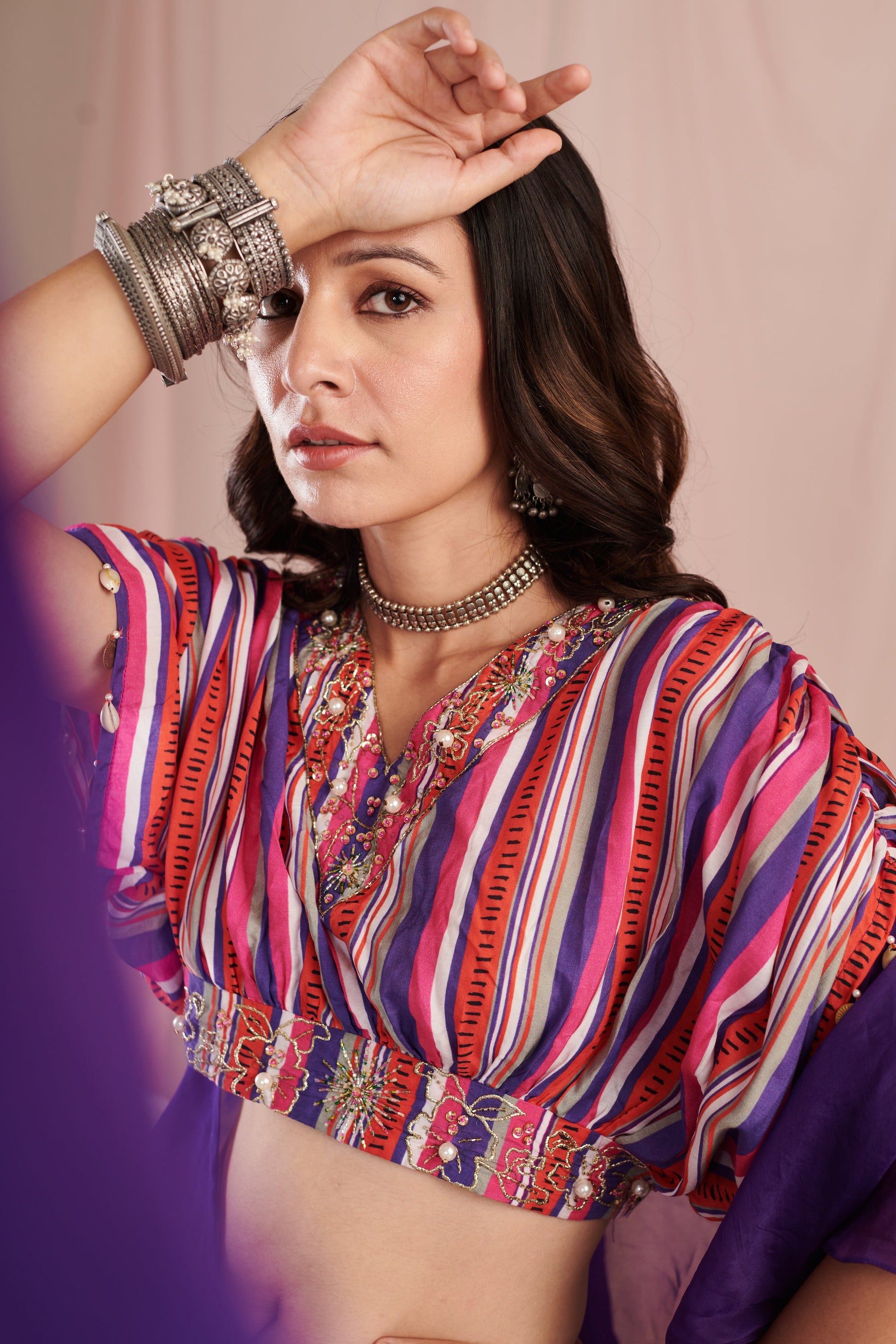 Purple Lehenga with beautiful pearl embroidery and digitally printed floral designs made of cotton silk.
