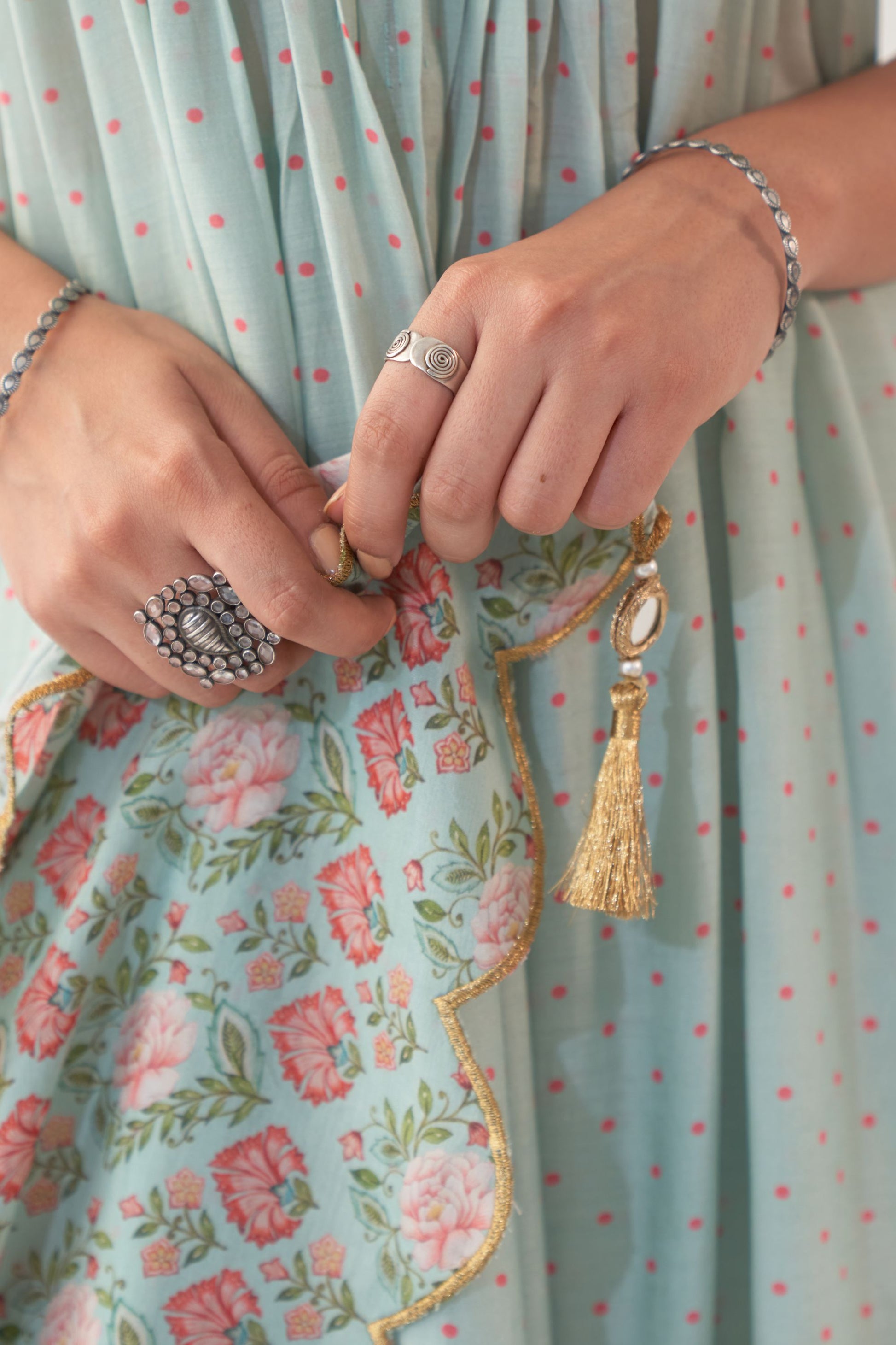 •digital printed chanderi dupatta with scalloped edges and mirror tassels on corners.