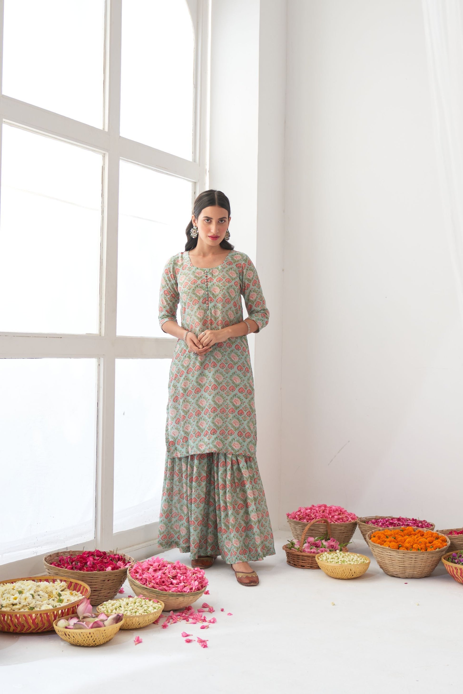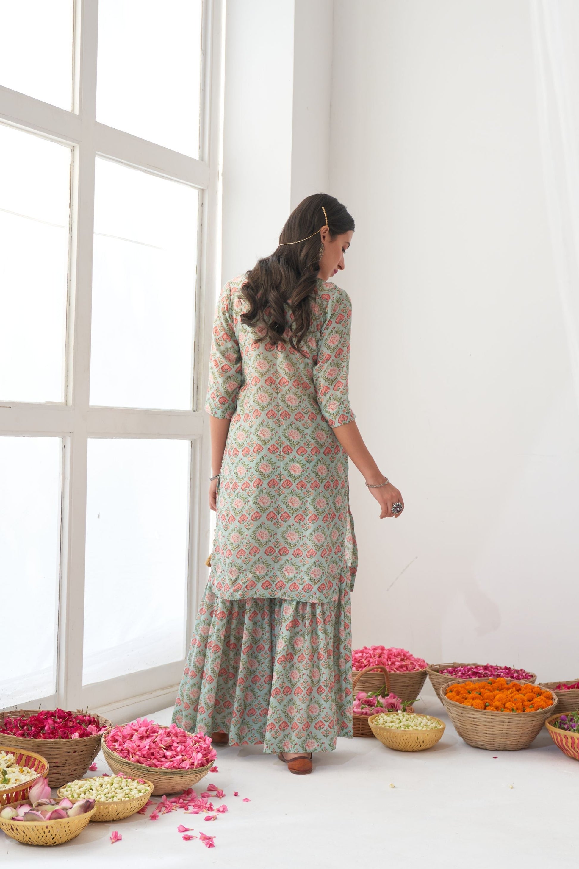•Featuring A three piece set that includes short kurta, sharara and dupatta.
