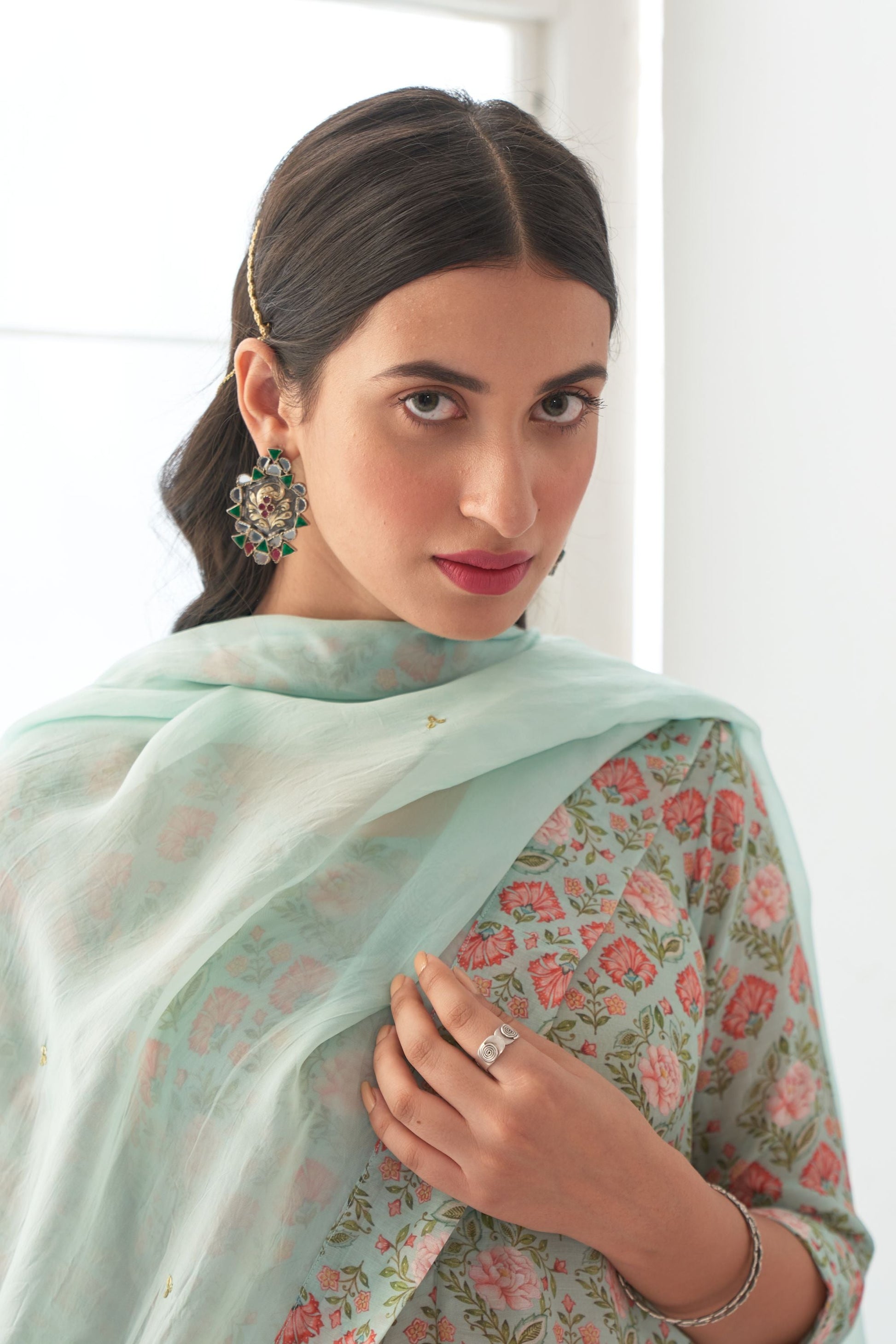 •Organza dupatta with scalloped edges and mirror tassels on corners.