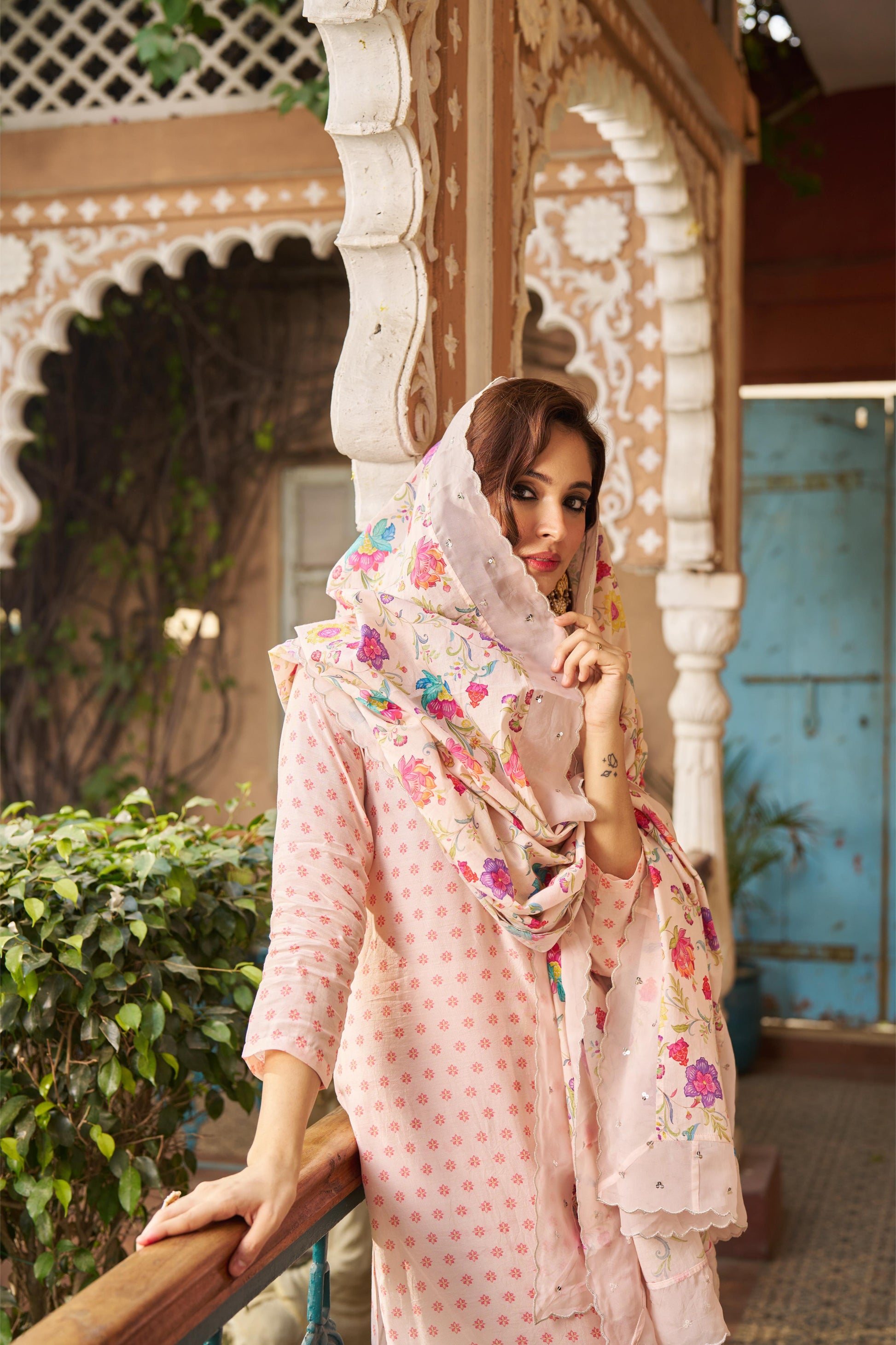 Dupatta Of Mul With Attached Organza On Edges With Sequence Work And Scalloped Edges.