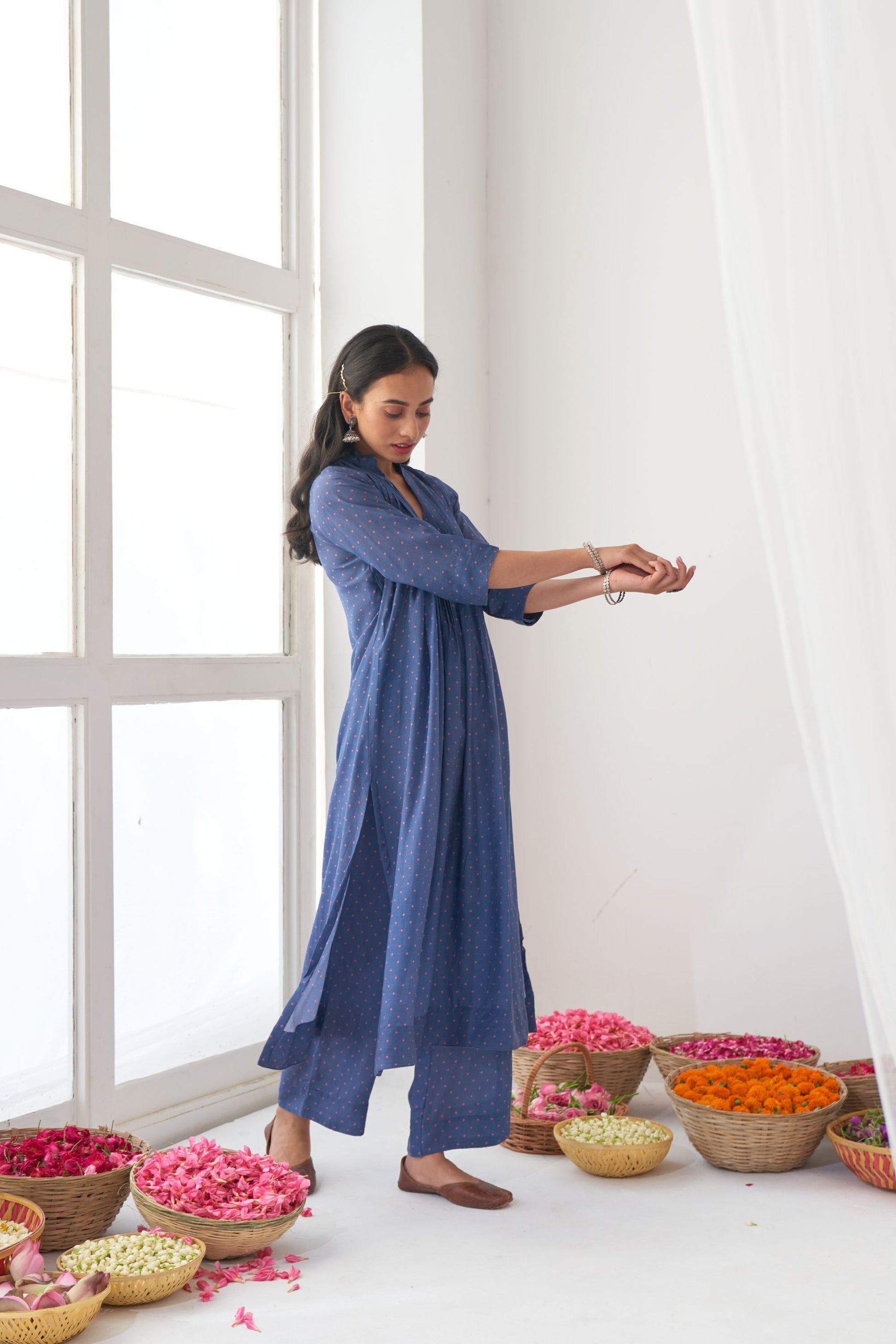 •A-line cotton silk kurta with pin tucks detailing on neckline, teamed with dot printed palazzo.