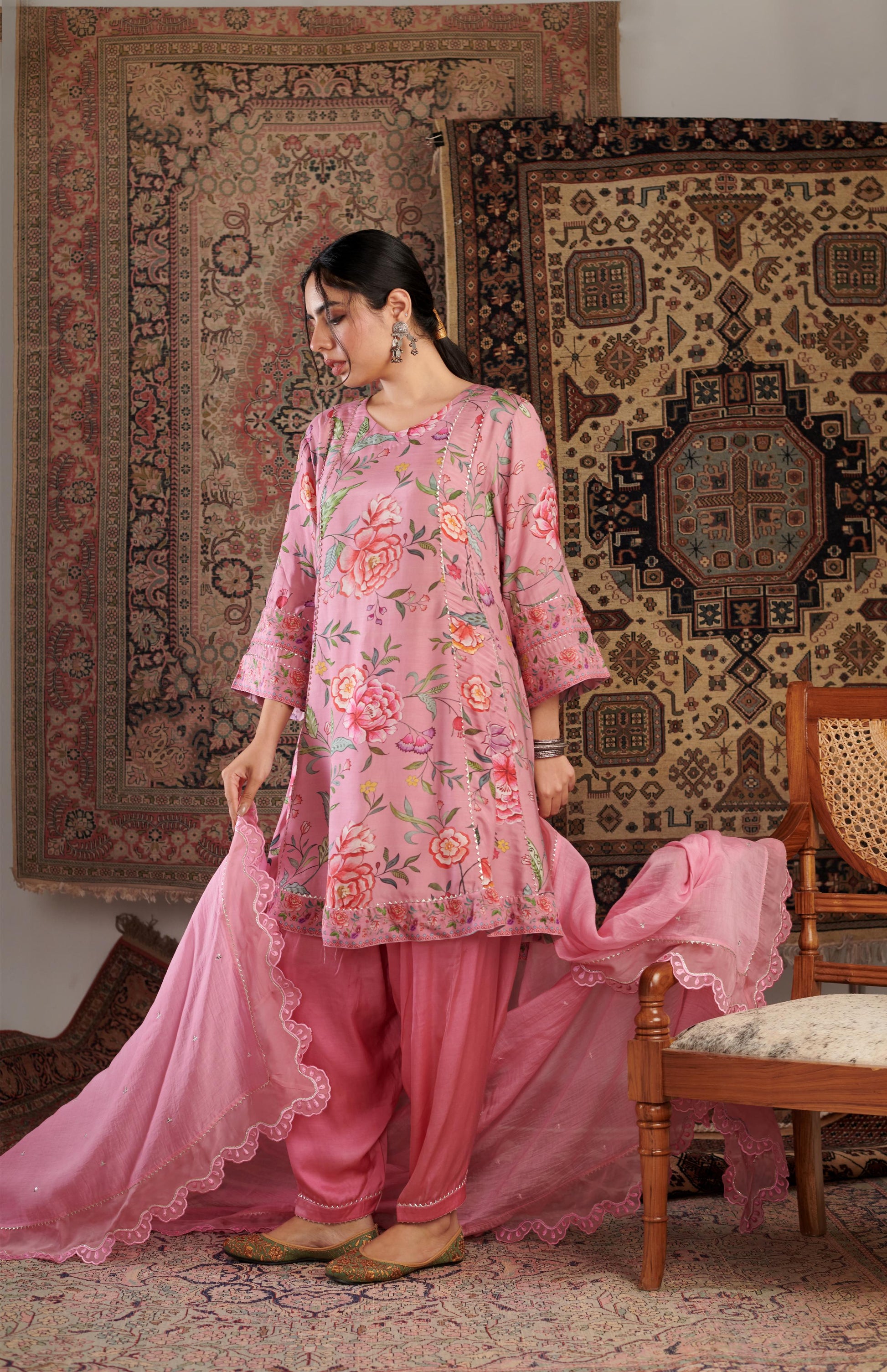Expertly crafted from a luxurious blend of cotton and silk, this CHINTZ OLD ROSE KURTA SET exudes elegance and grace. The short Anarkali style kurta features bell sleeves for added flair, while the modal salwar provides comfort and ease of movement. The hand embroidered chanderi dupatta adds a touch of sophistication with its attached embroidered organza edges. Elevate your wardrobe with this stunning ensemble.