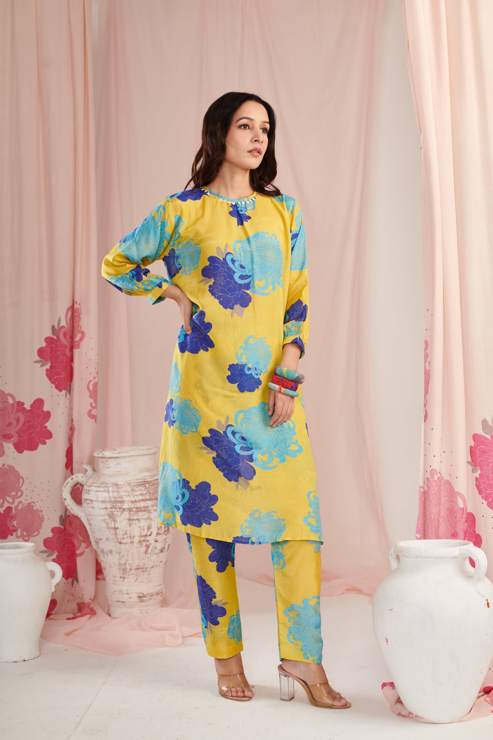 Digital printed cotton silk kurta set with beautiful hand emblishment on neck line paired with digital printed pants