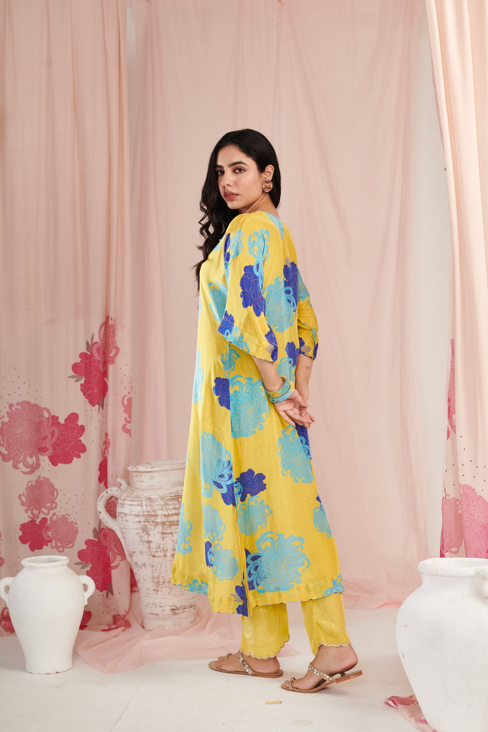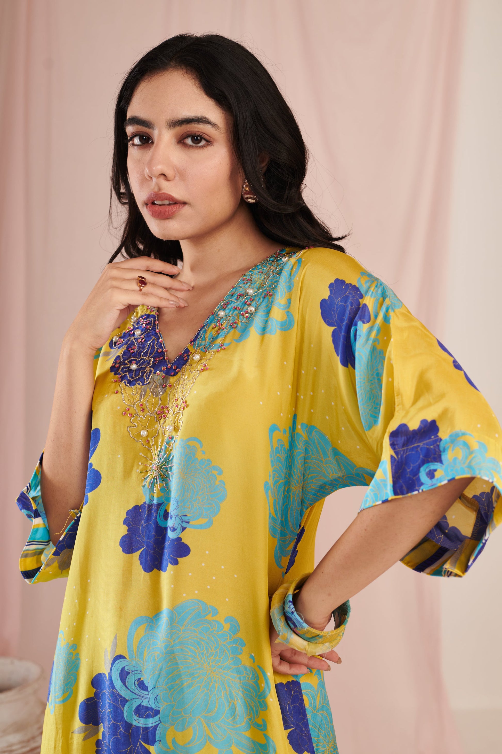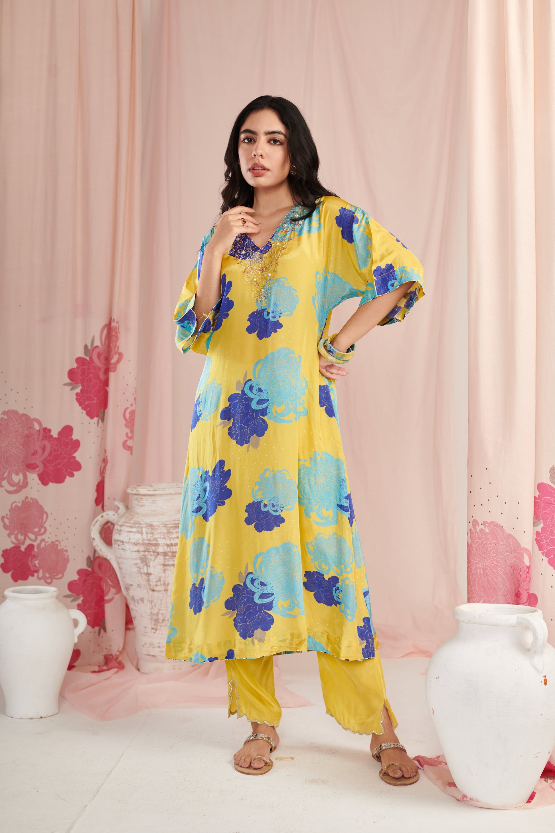 Crepe kaftan kurta with pearl work on neckline paired with crape pants with applique gota embroidery.