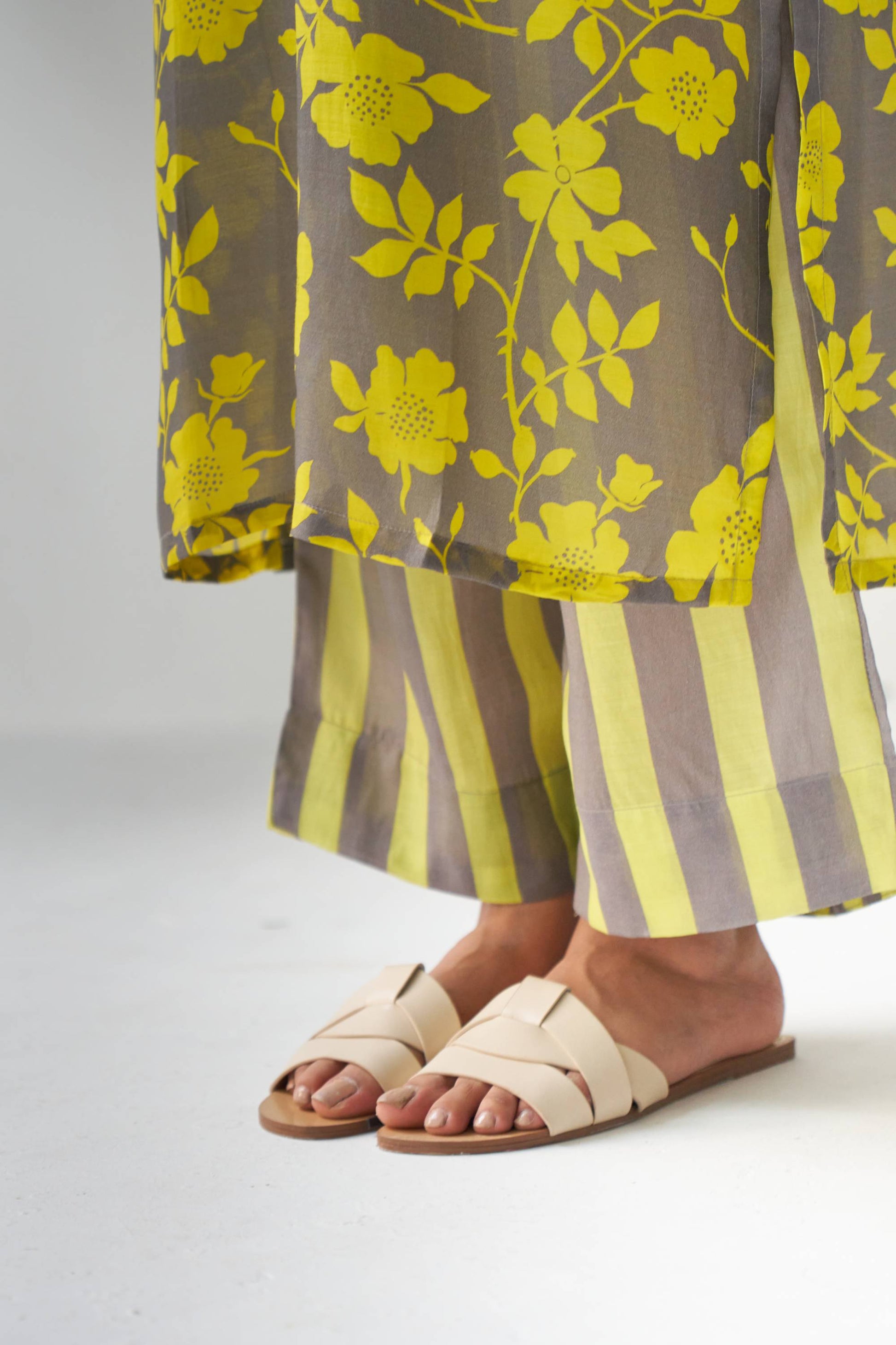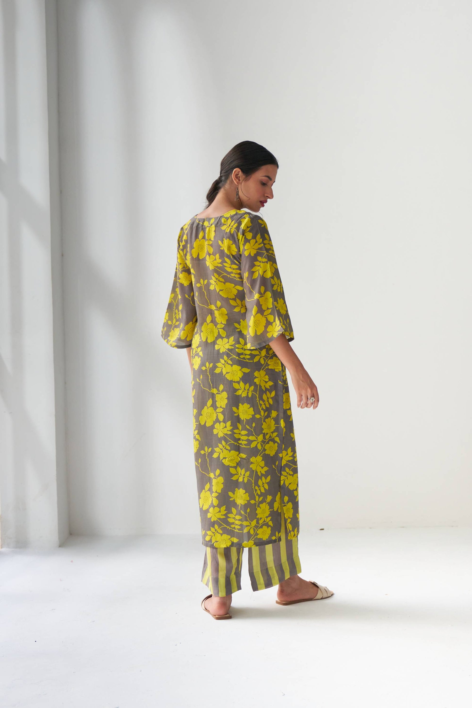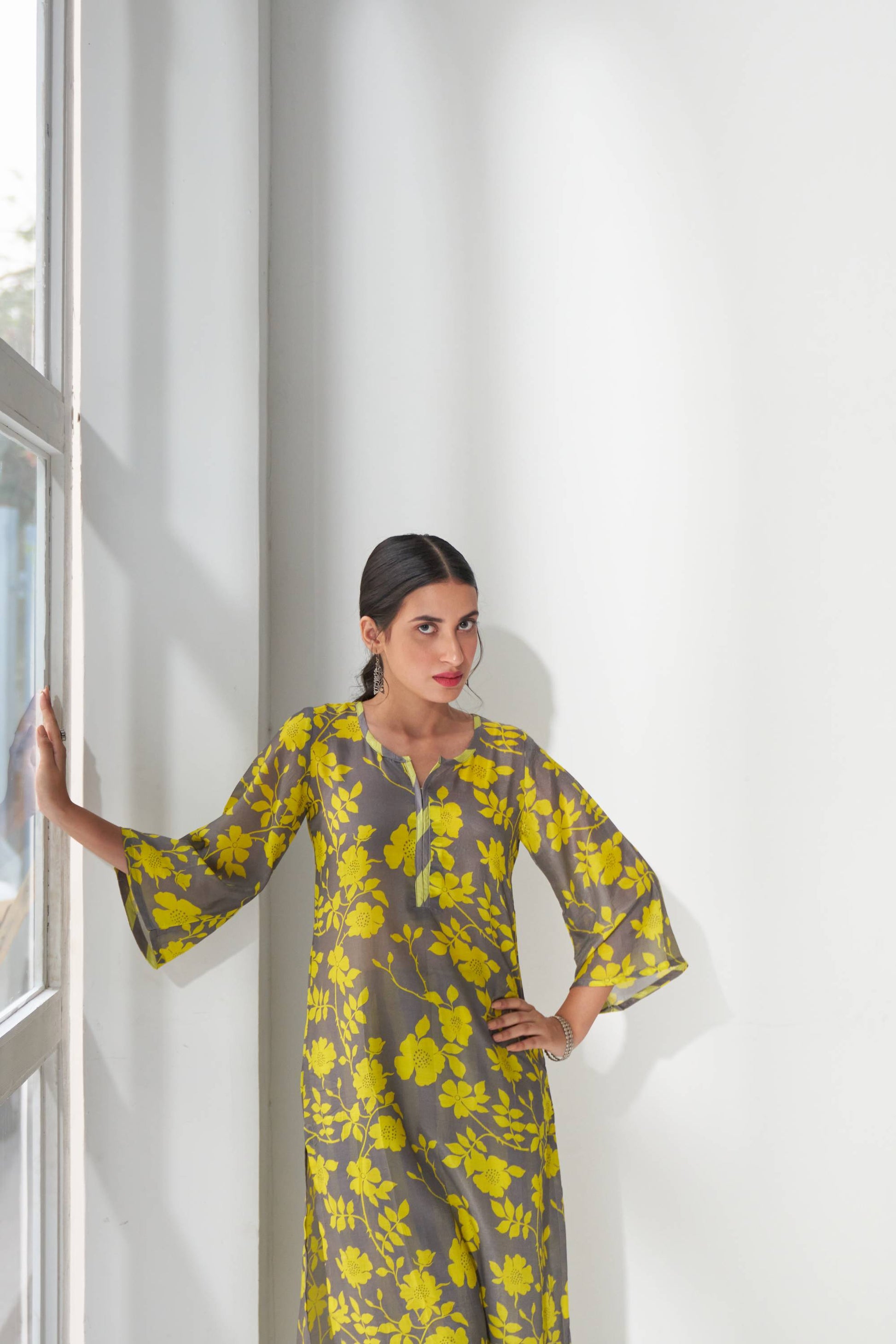Faded rose kurta pant set in cotton silk fabric with beautiful floral digital print. The kurta with bell sleeves and pants with a wide bottom opening.