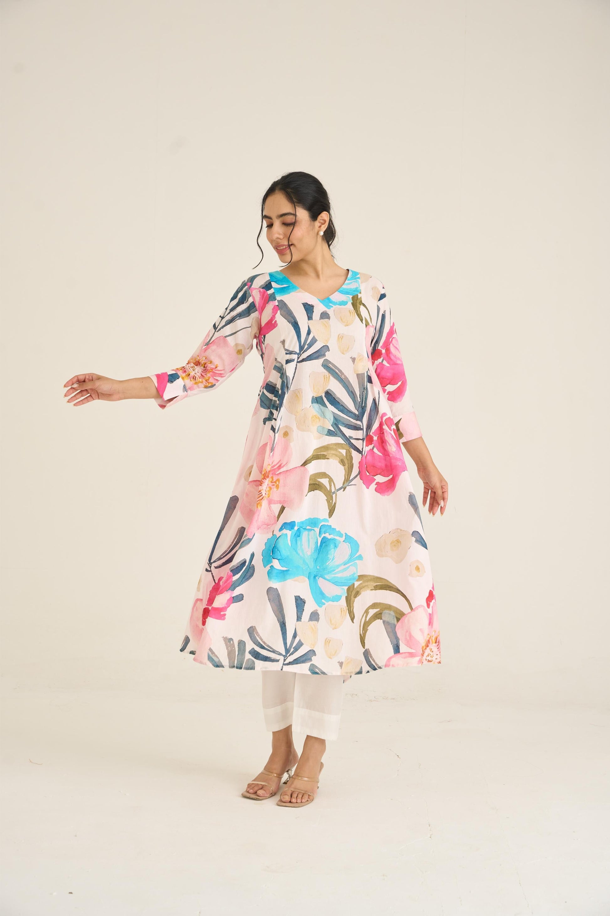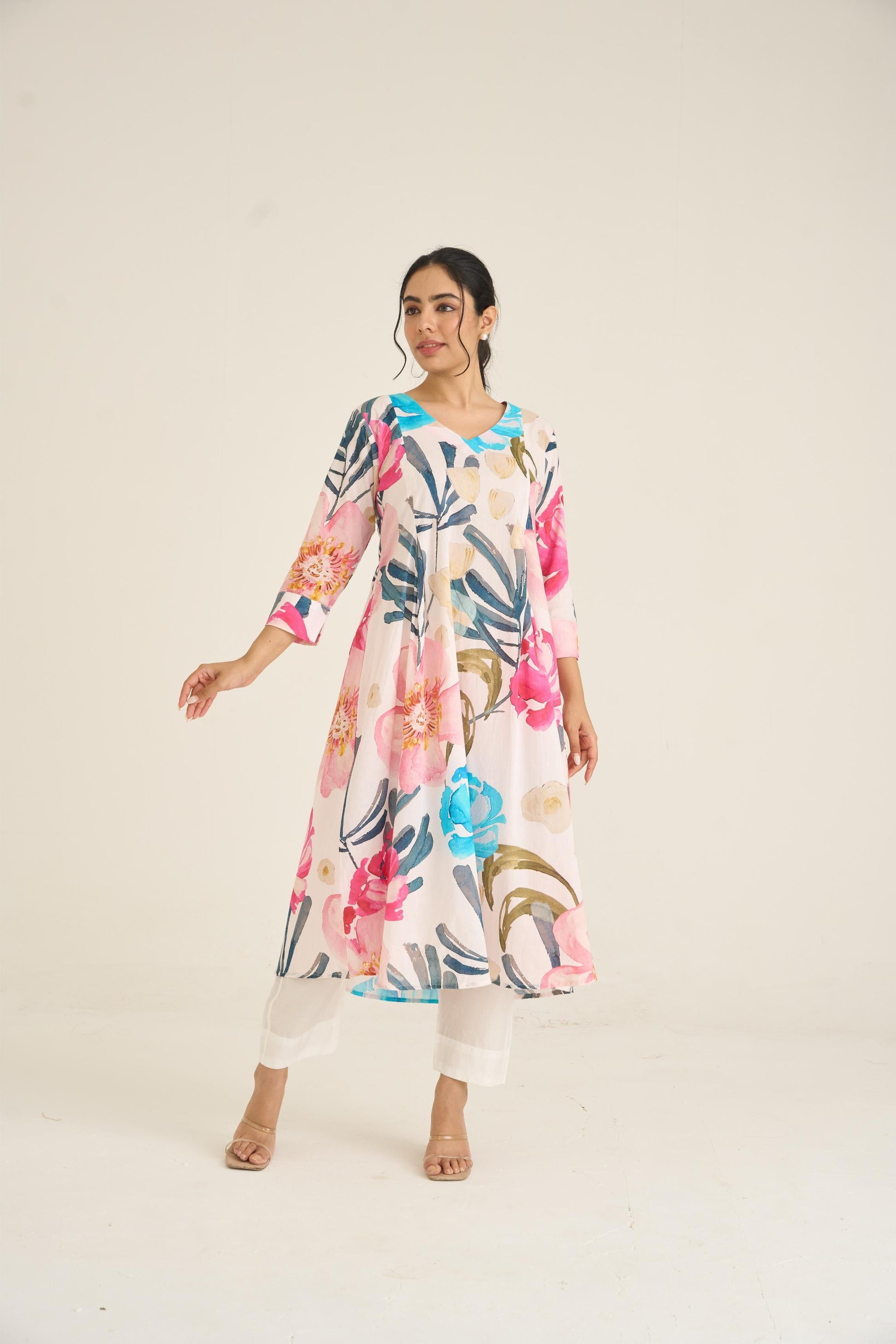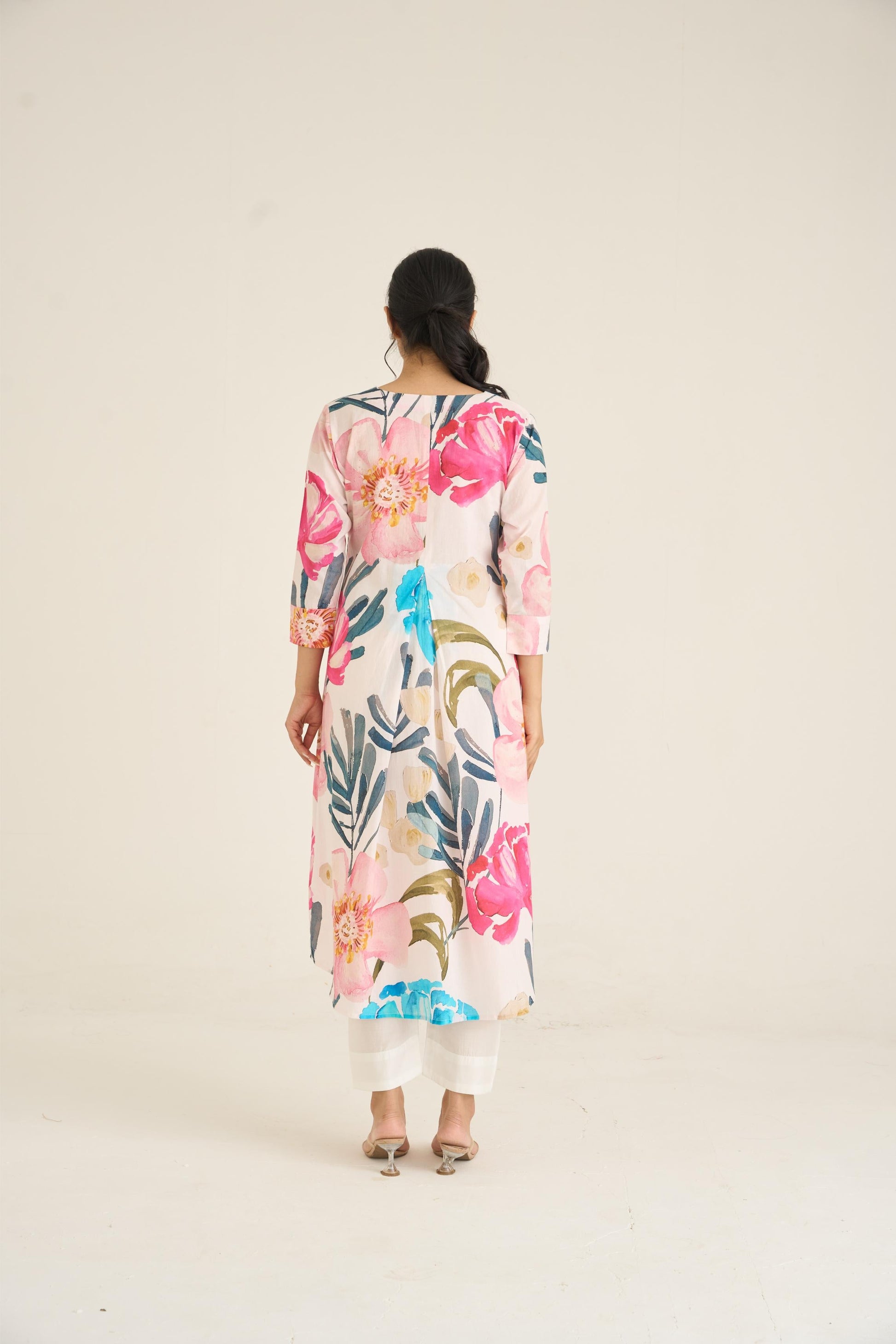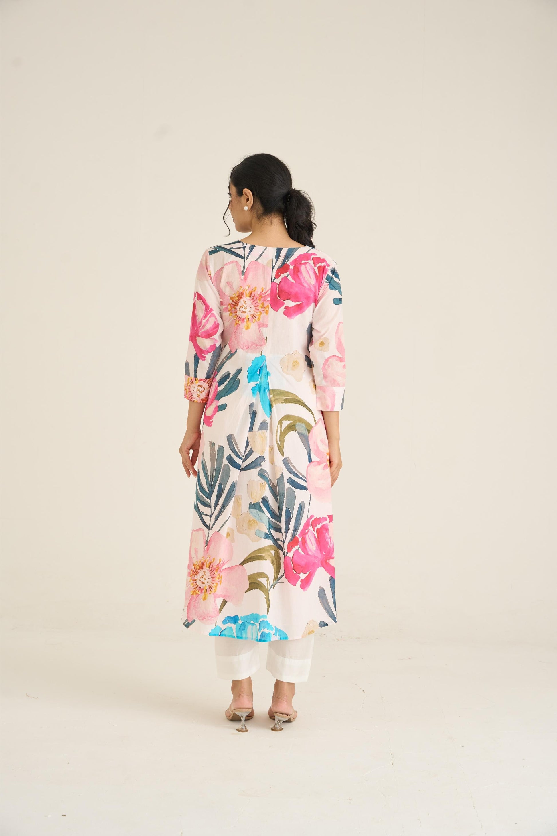 Make a bold statement with our rose belle 2-piece set—where classic meets contemporary. Crafted from a soft, breathable silk chanderi this vibrant ensemble features a pin tuck kurta adorned with delicate floral beaded hand-embroidery offering a touch of elegance to its minimal design.