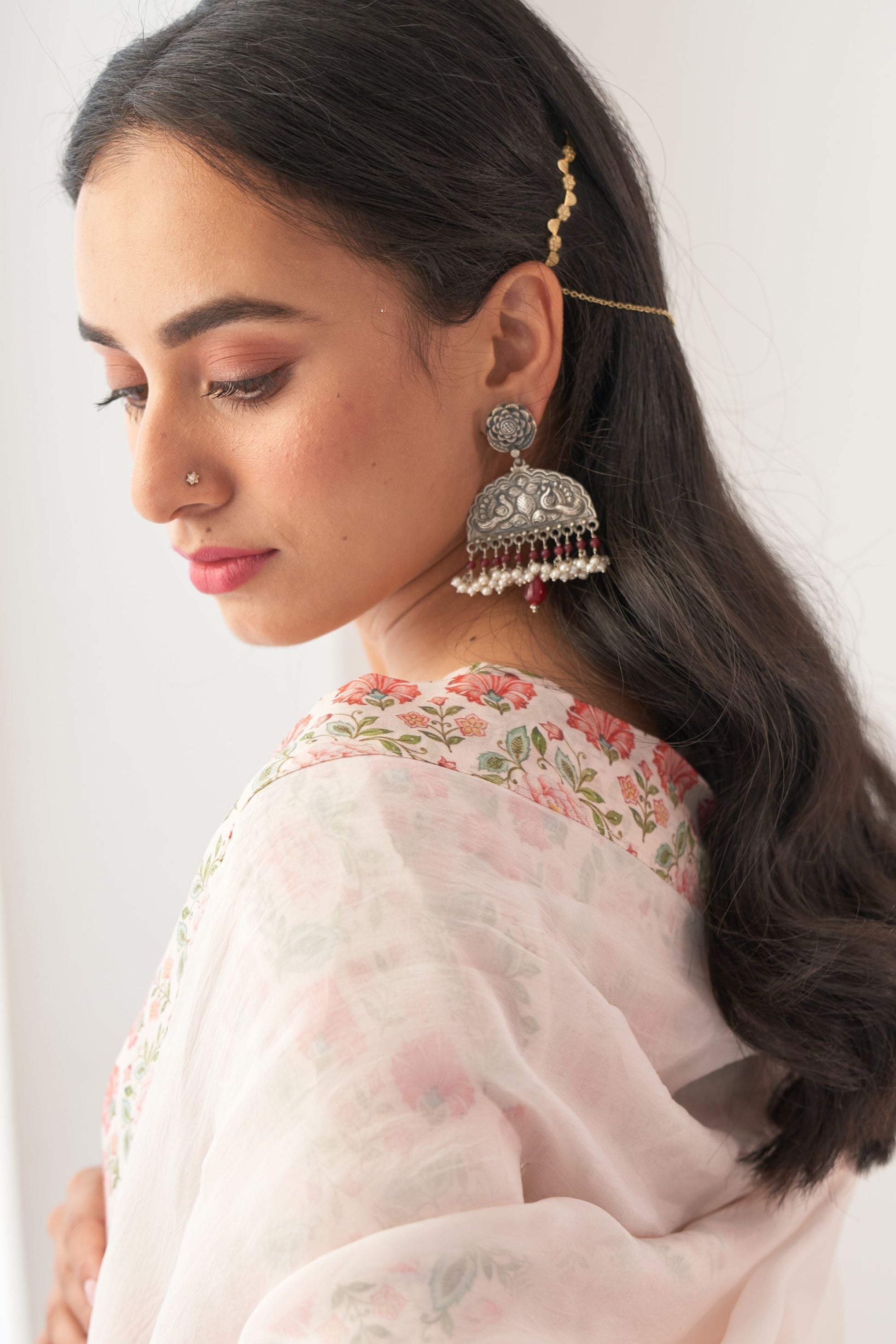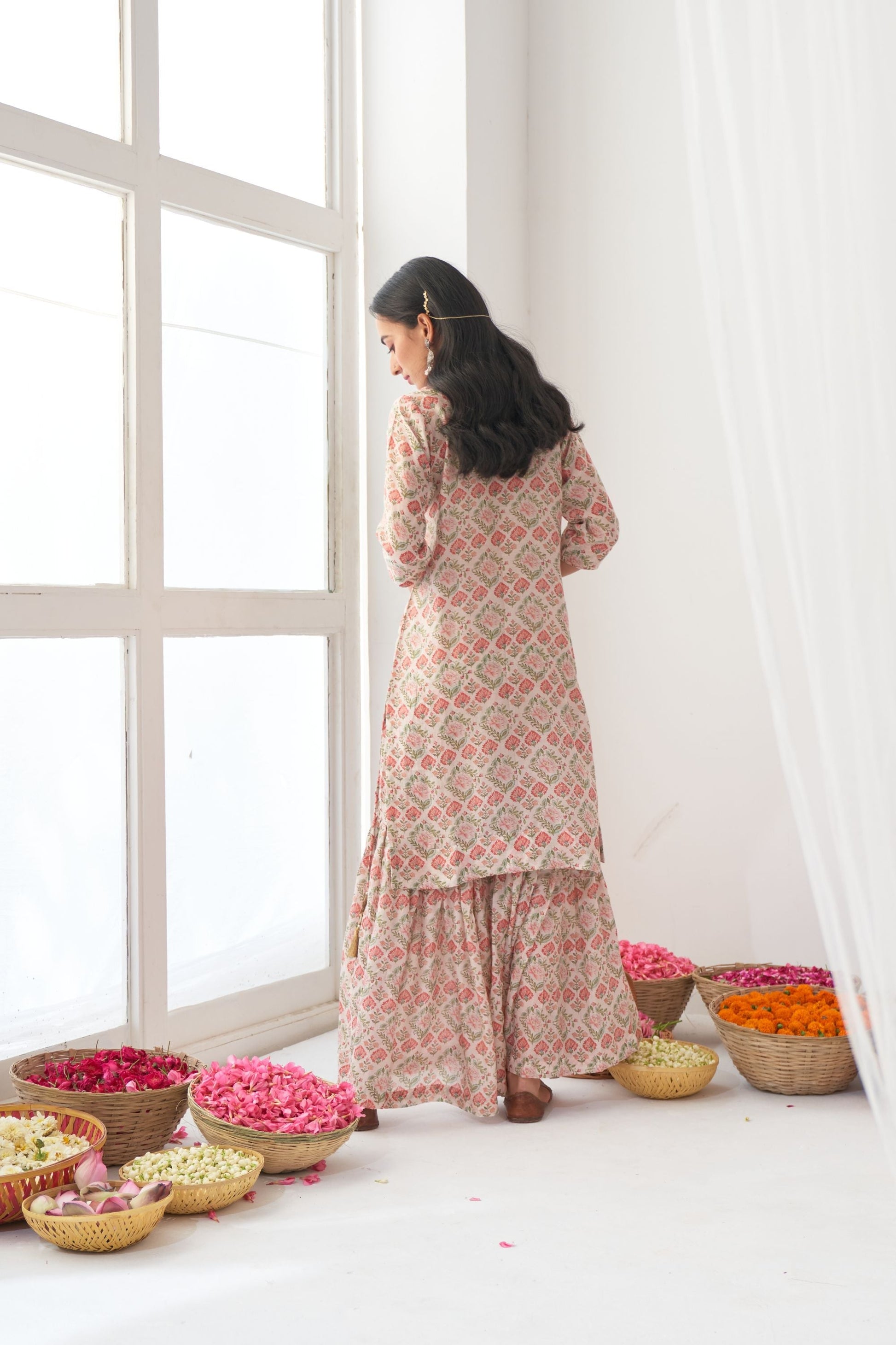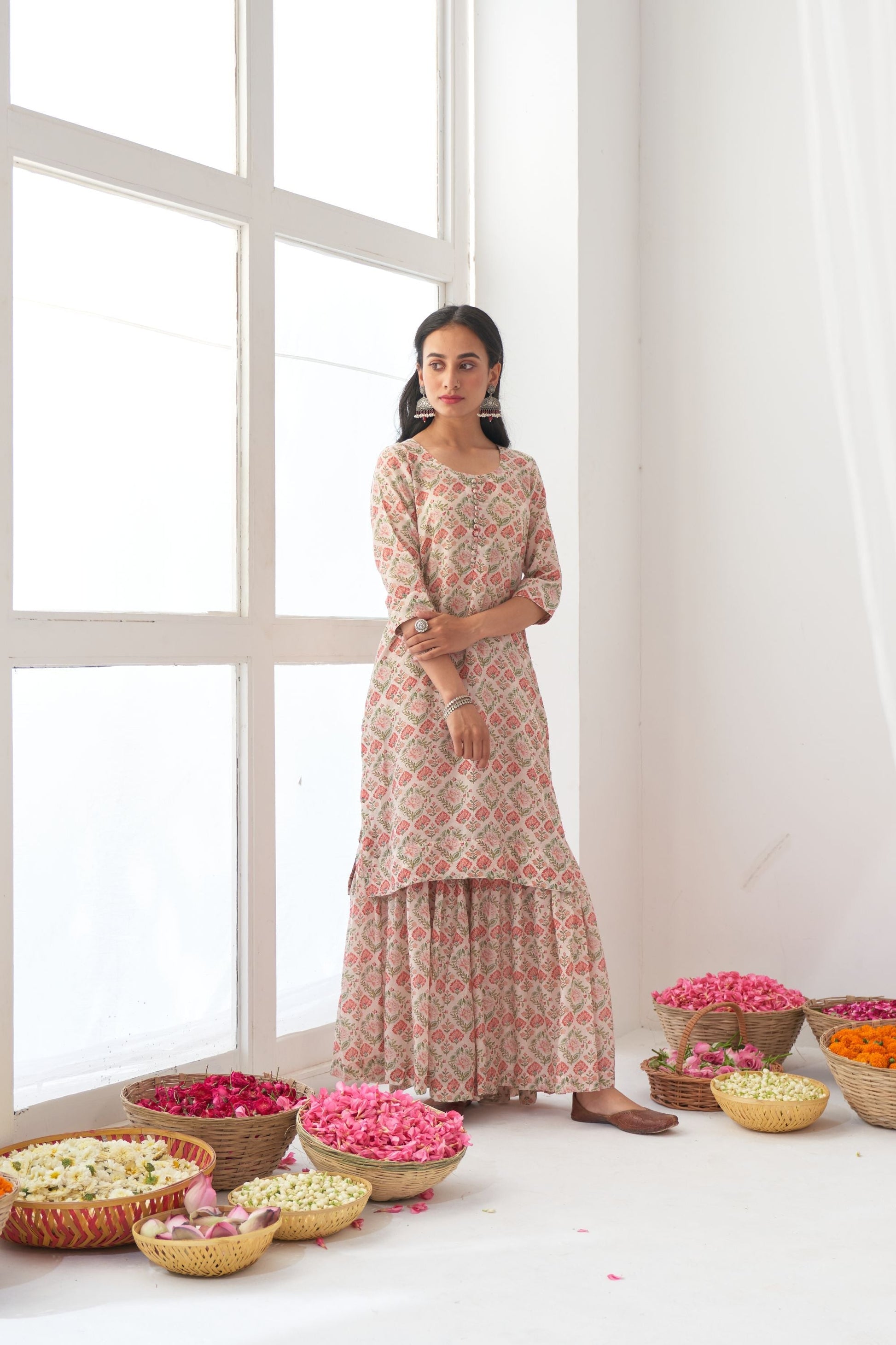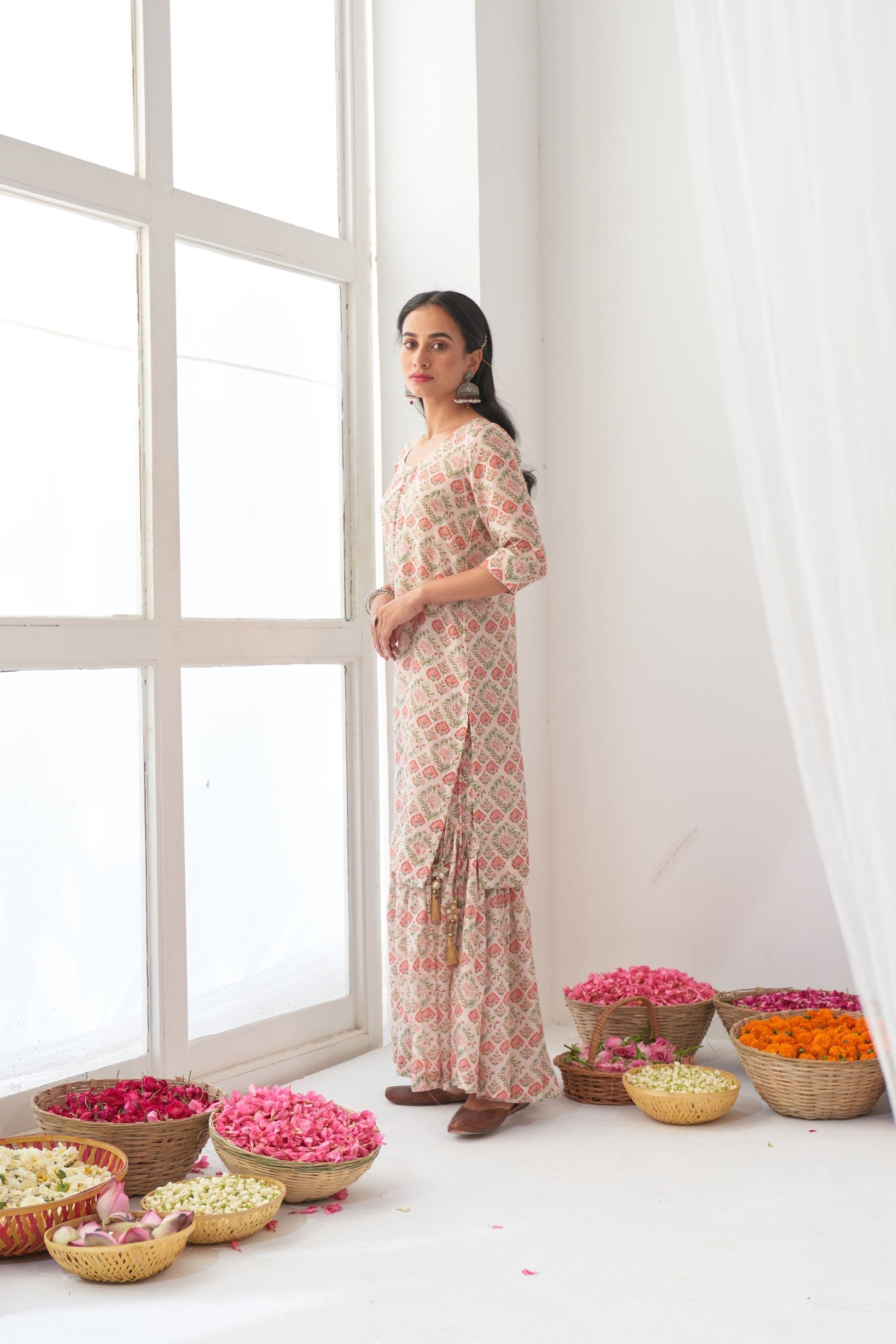 •Peony flower digital printed short kurta in cotton silk with potli botton detailing on the yoke.