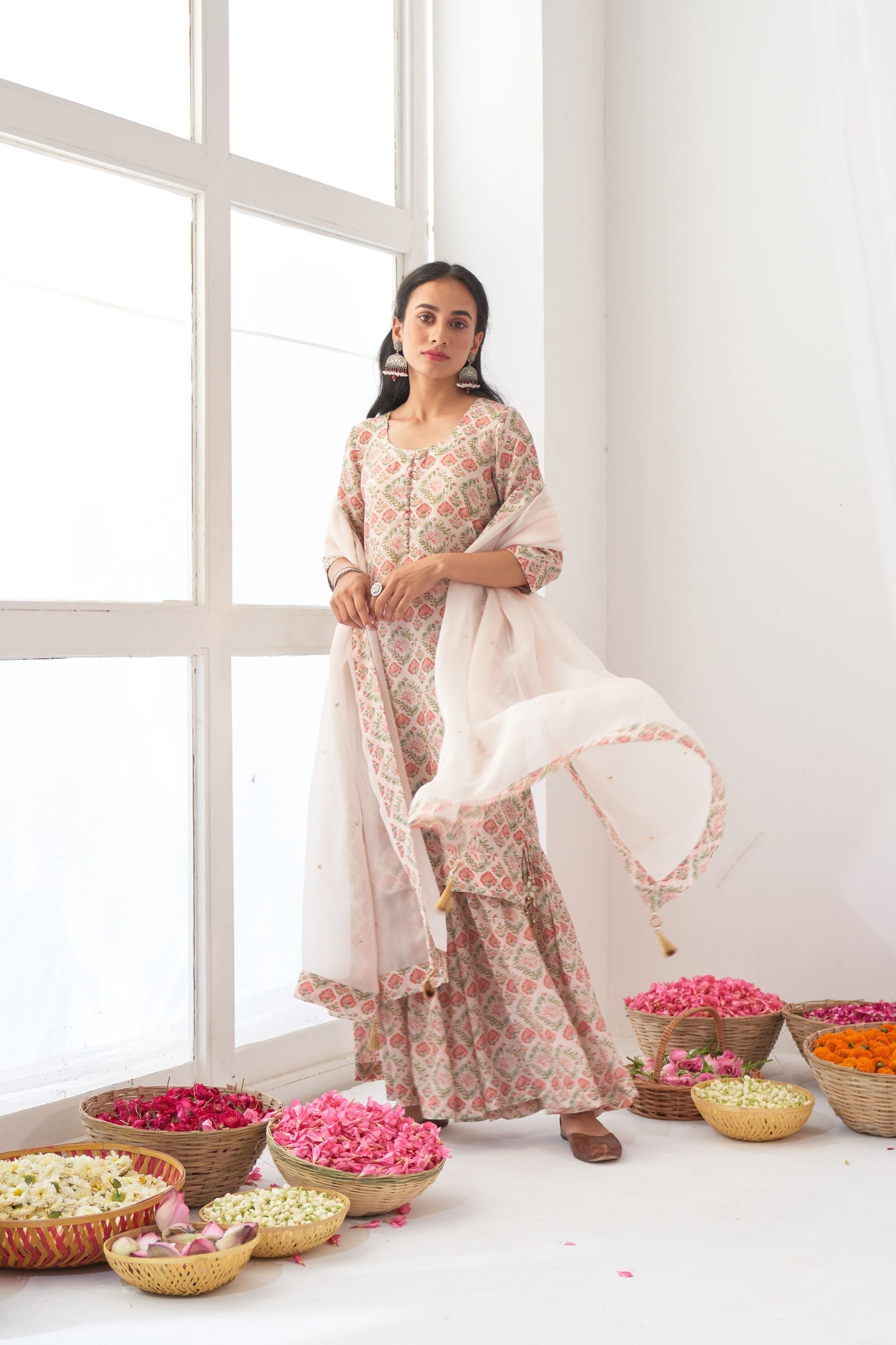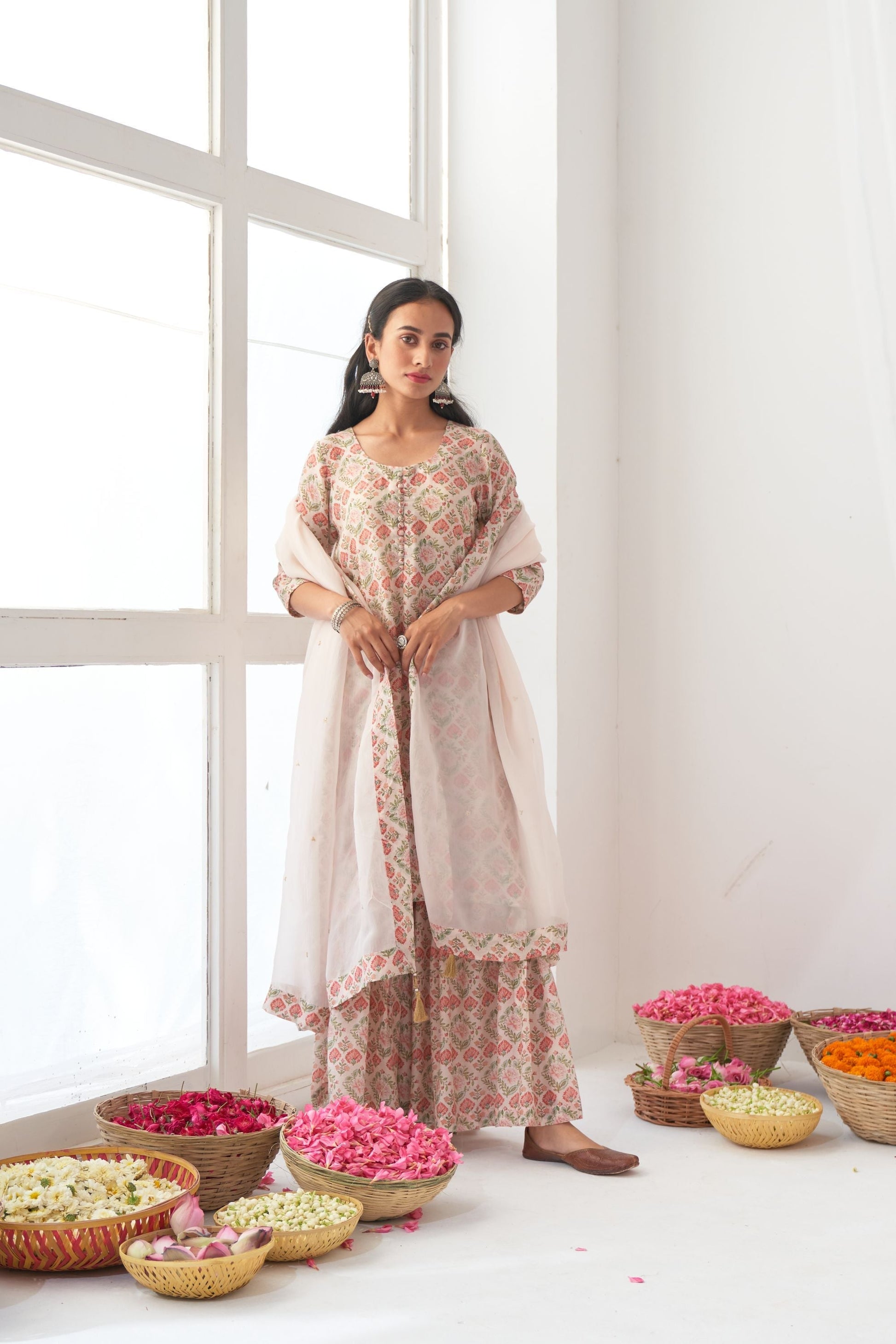 •Featuring A three piece set that includes short kurta, sharara and dupatta.