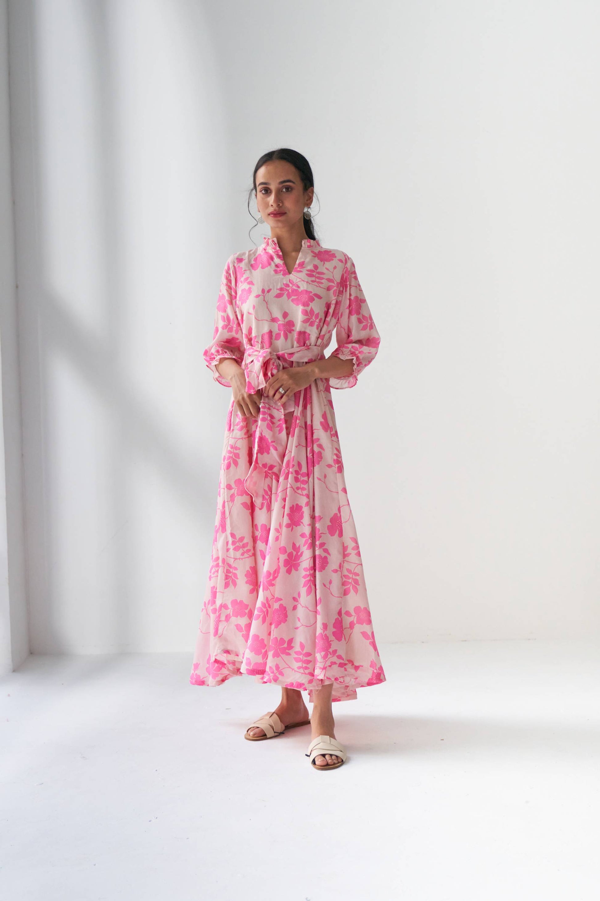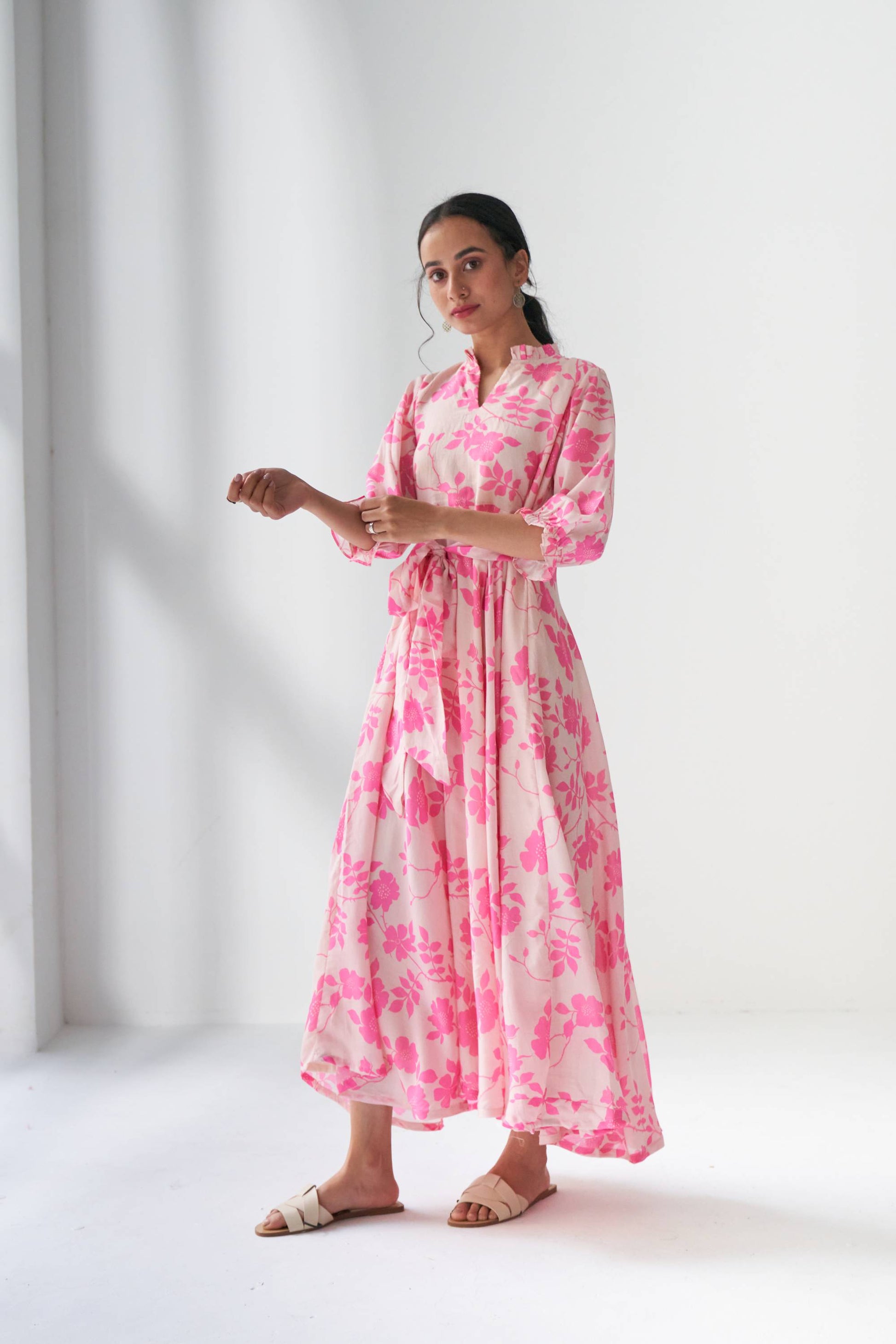 Our Lovestruck flared dress in cotton silk with beautiful bold floral digital print with a attached belt for fitting. This is dress is quintessence for summer time.