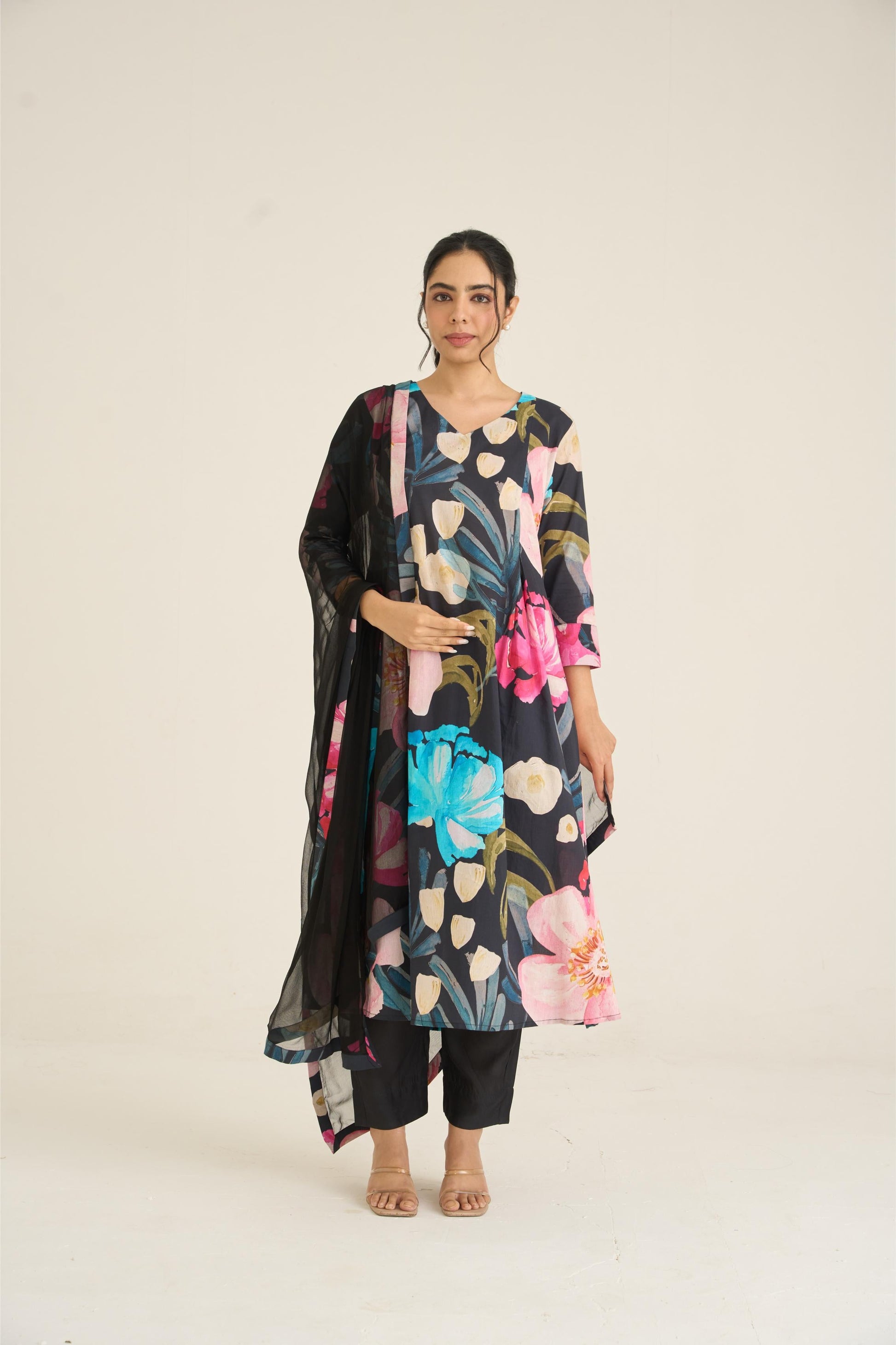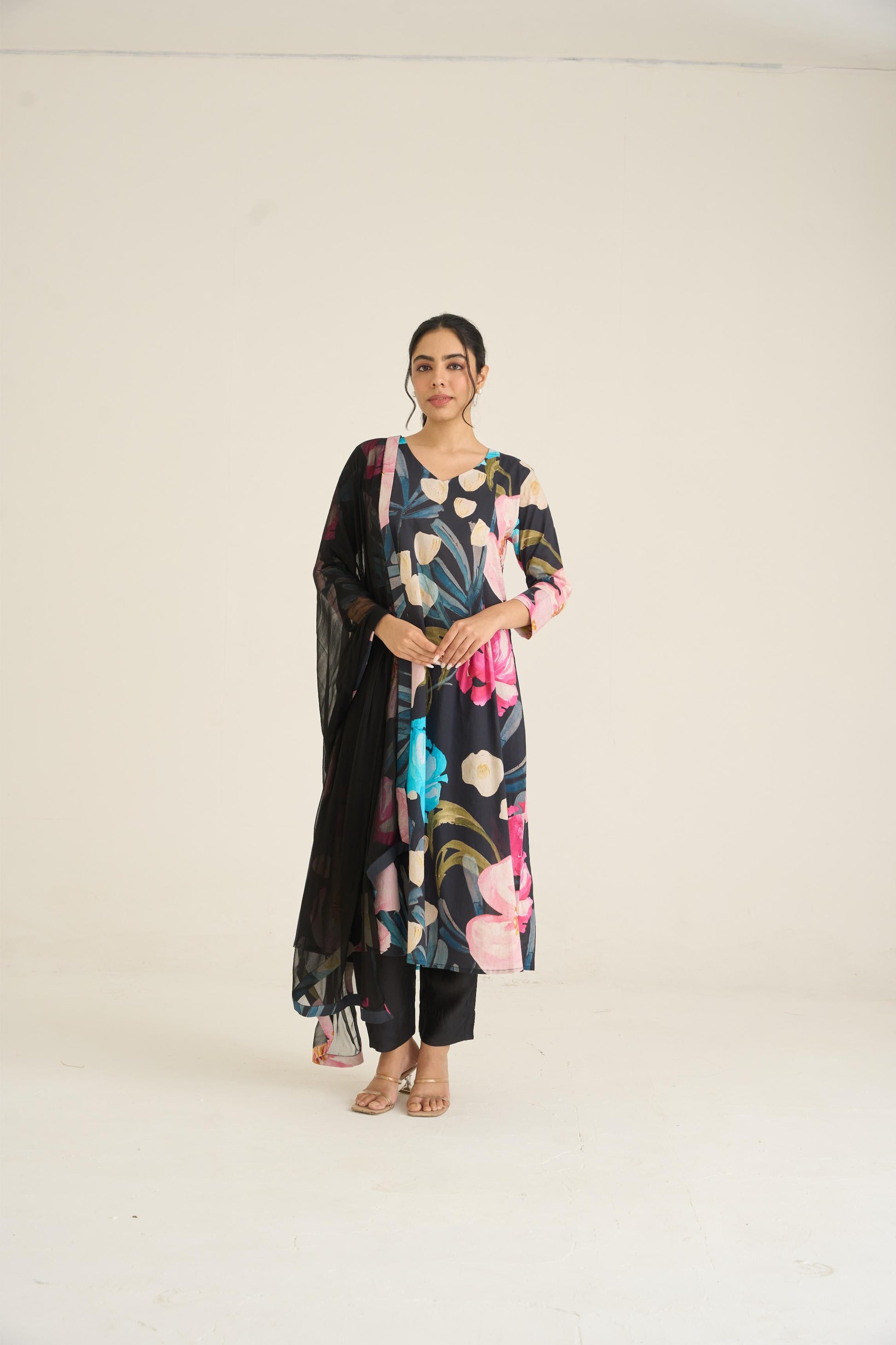 Make a bold statement with our rose belle 2-piece set—where classic meets contemporary. Crafted from a soft, breathable silk chanderi this vibrant ensemble features a pin tuck kurta adorned with delicate floral beaded hand-embroidery offering a touch of elegance to its minimal design.