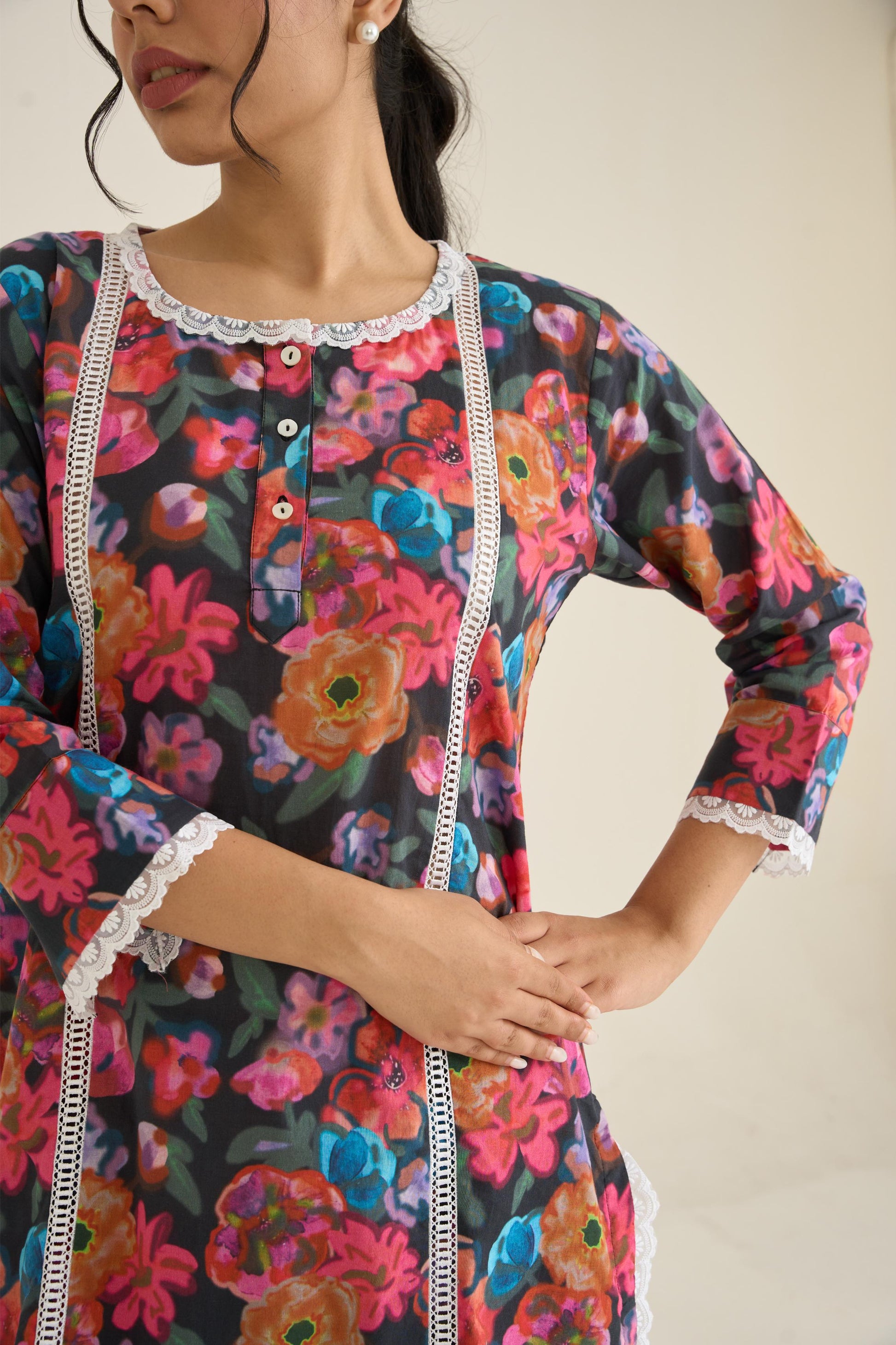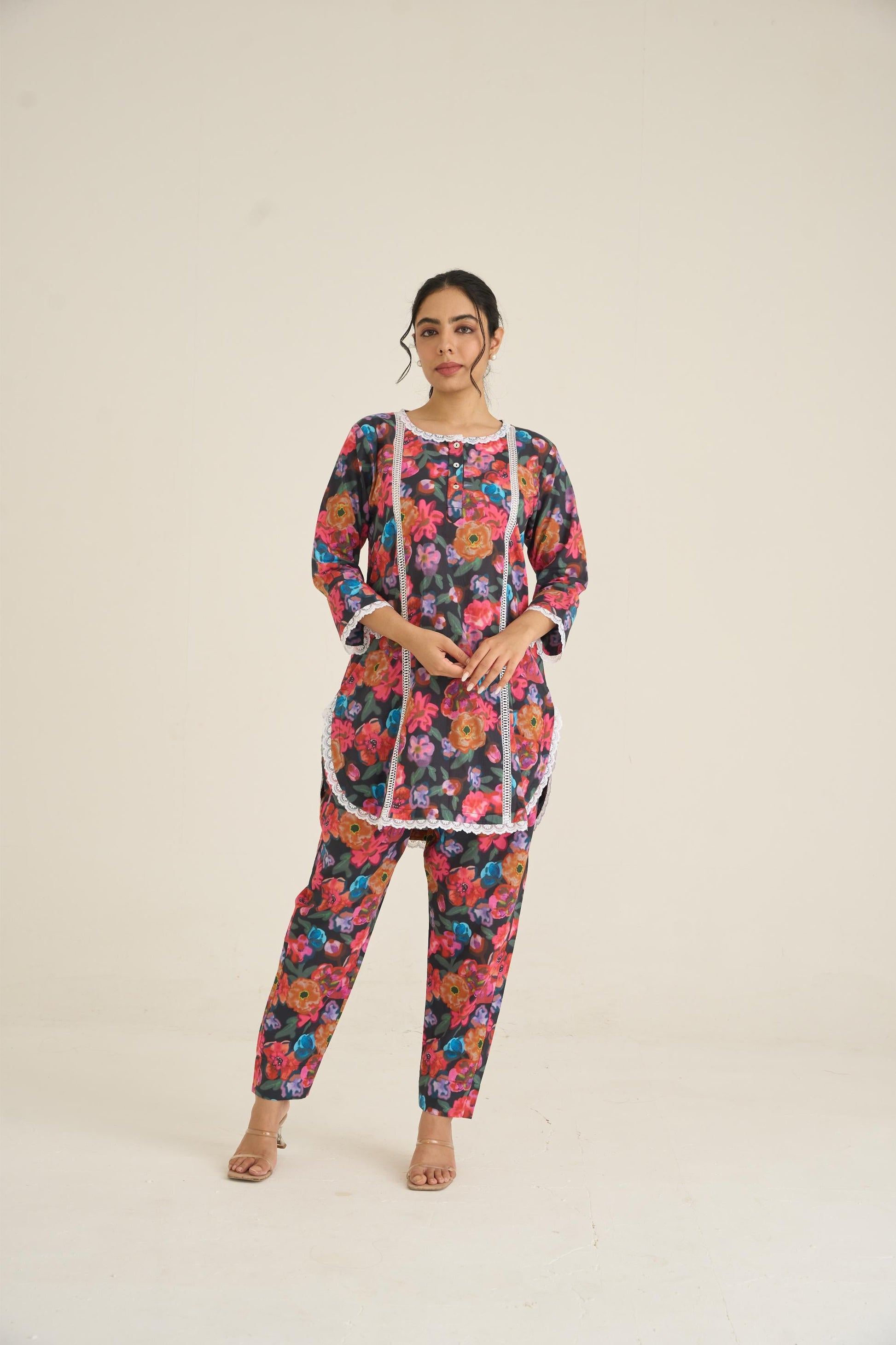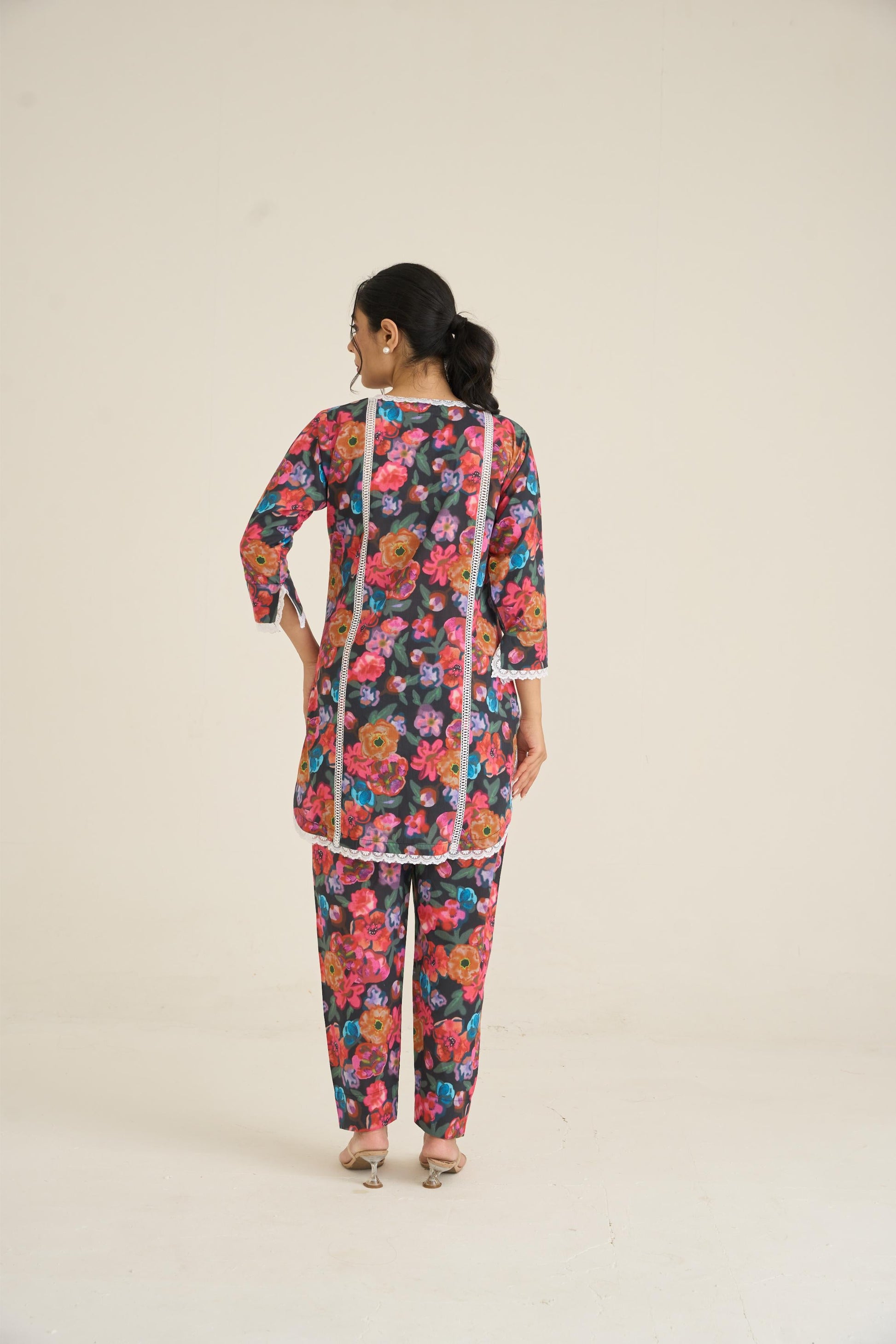 The matching tapered trousers carry the floral motif seamlessly, creating a coordinated and cohesive look. The lightweight digital printed dupatta, trimmed with white lace, adds graceful movement and charm to the outfit.