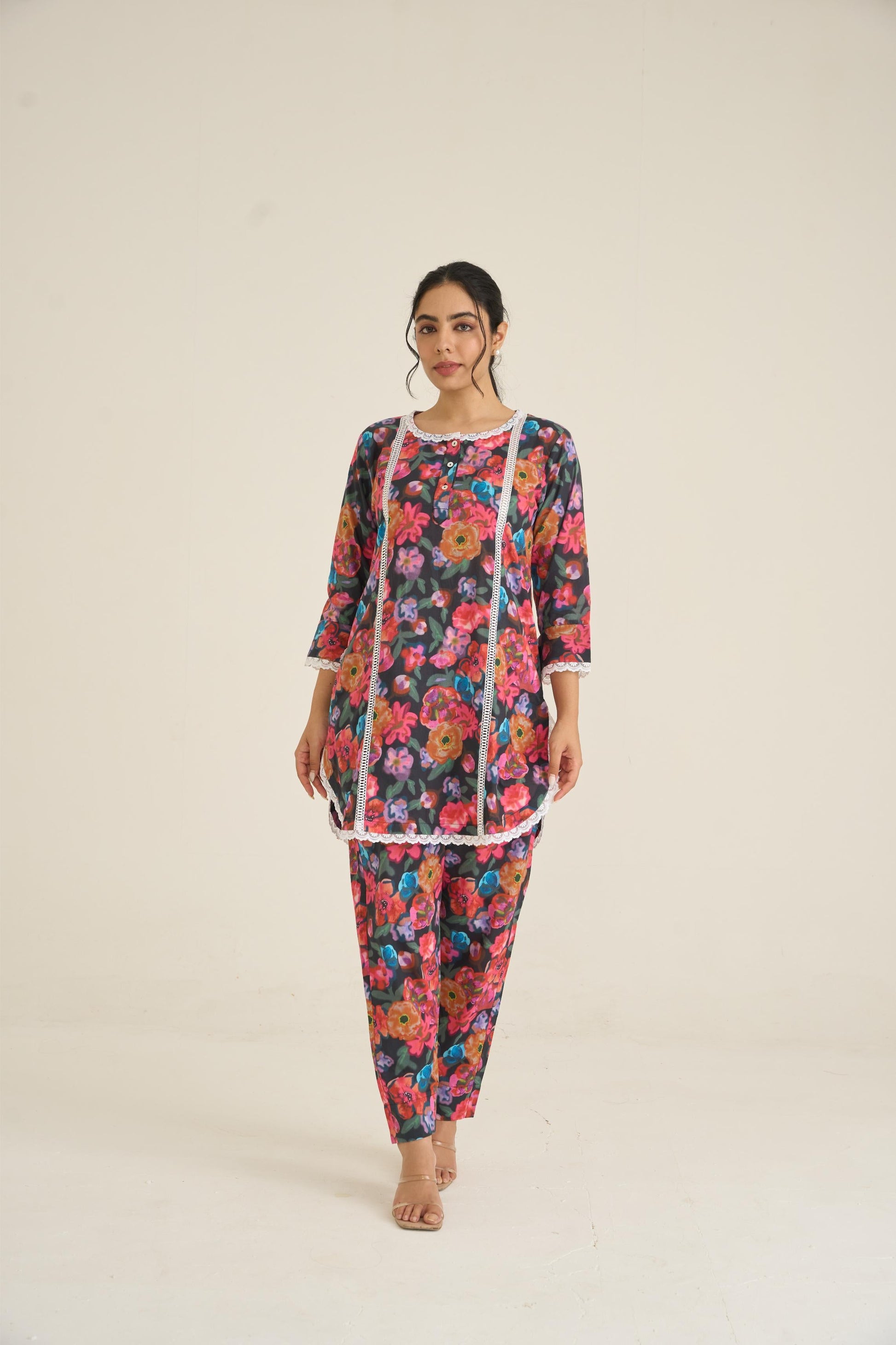 Step into summer with our Floral Fusion Lawn– a vibrant celebration of color, comfort, and style. This ensemble features a digitally printed shirt and trousers adorned with a bold and lively floral pattern. The straight-cut shirt is elegantly accented with lace detailing on the sleeves, hem and neckline offering a refined touch to the playful print.