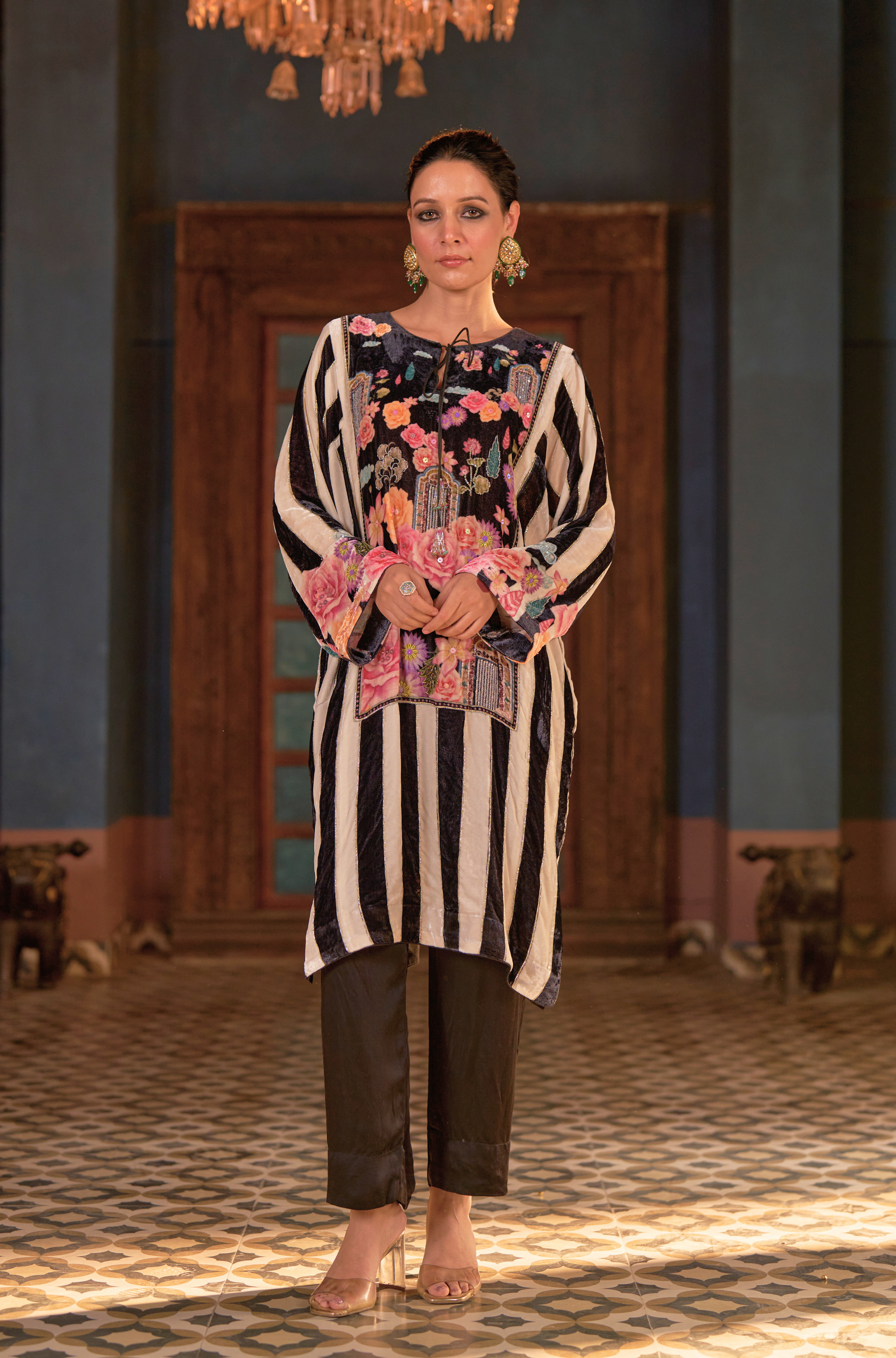 This set features a digital printed luxurious silk velvet phiran, highlighted with handmade tassels adorning the neckline for a touch of artisanal charm. It is paired with modal silk pants for a refined yet comfortable fit, and a silk velvet digital placement odhini.