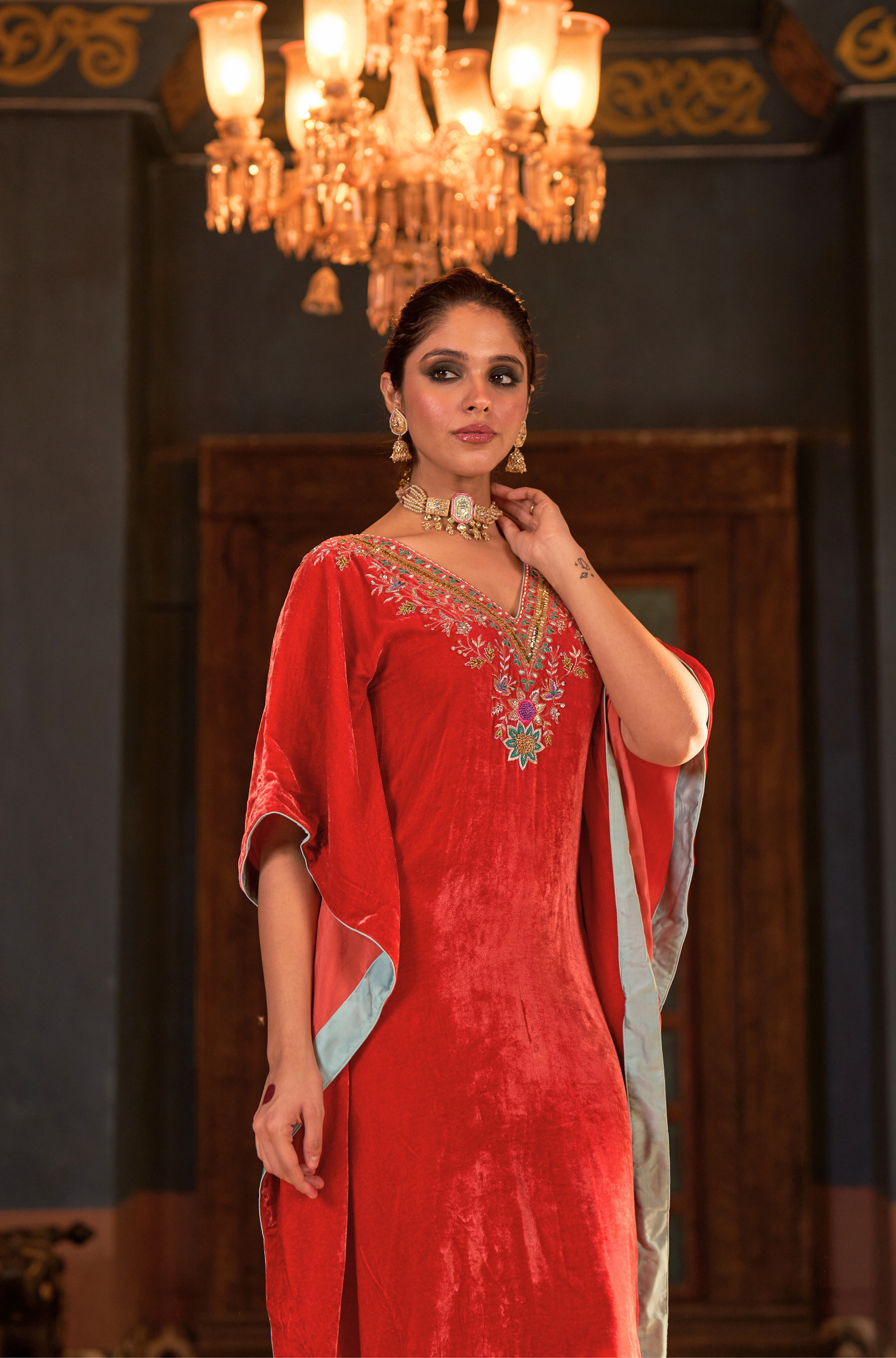 This color-blocked kaftan is adorned with intricate hand-embroidered zardozi, silk thread, and gota work, beautifully highlighting the neckline with an eye-catching floral pattern.