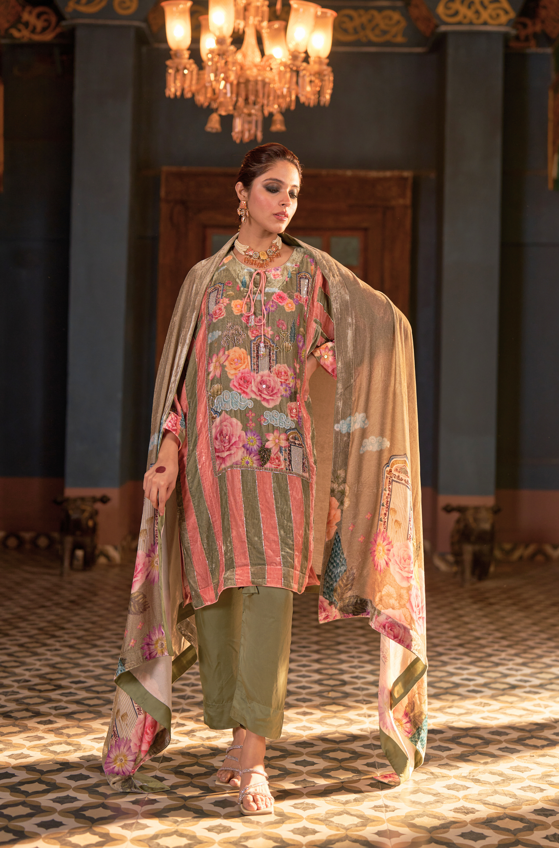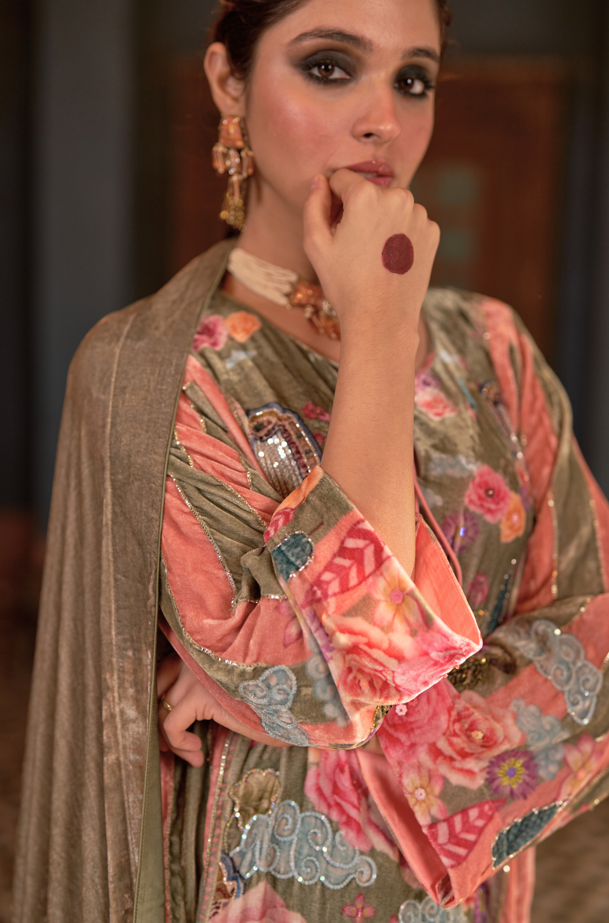 This set features a digital printed luxurious silk velvet phiran, highlighted with handmade tassels adorning the neckline for a touch of artisanal charm. It is paired with modal silk pants for a refined yet comfortable fit, and a silk velvet digital placement odhini.