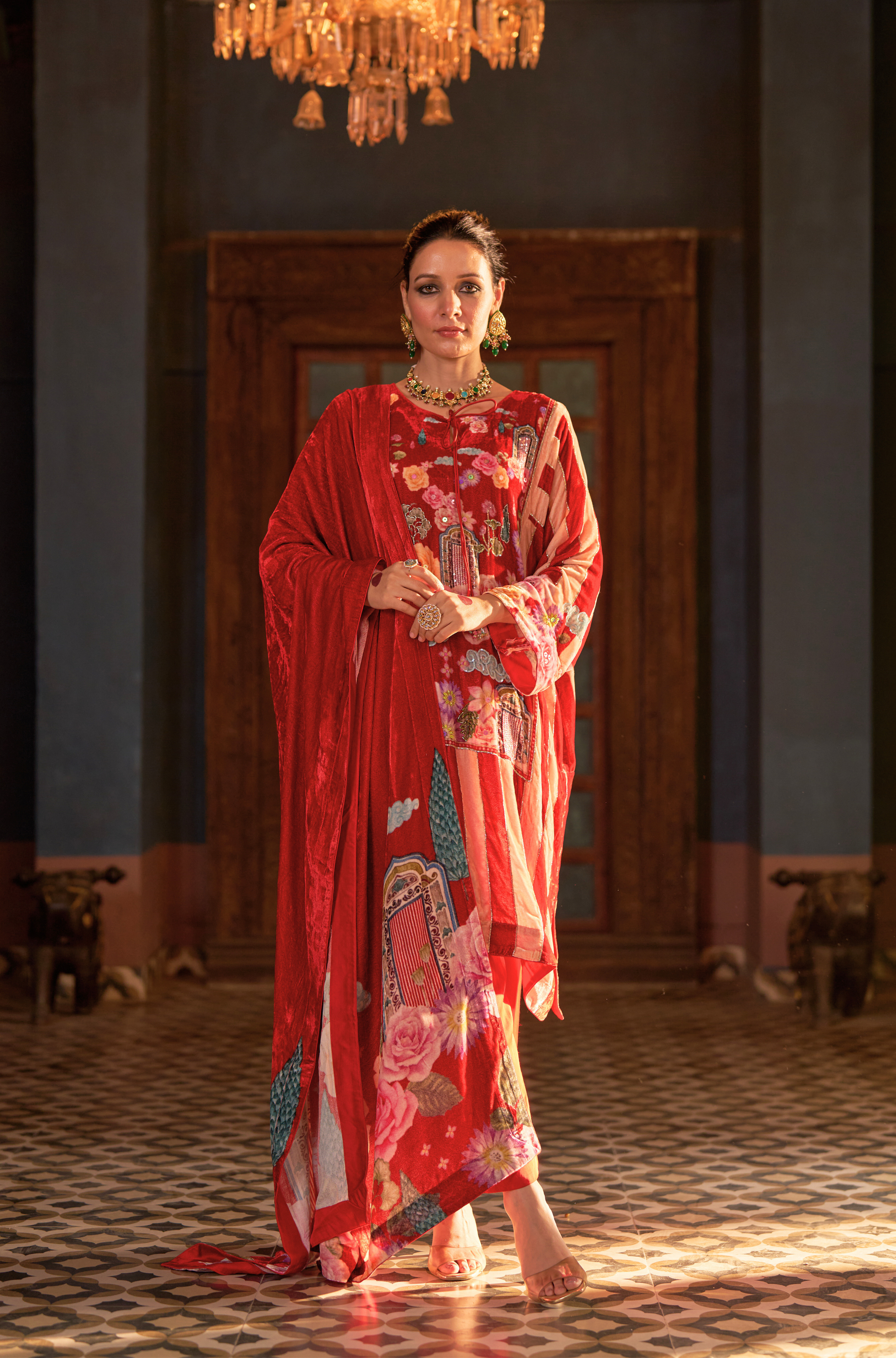 This set features a digital printed luxurious silk velvet phiran, highlighted with handmade tassels adorning the neckline for a touch of artisanal charm. It is paired with modal silk pants for a refined yet comfortable fit, and a silk velvet digital placement odhini.