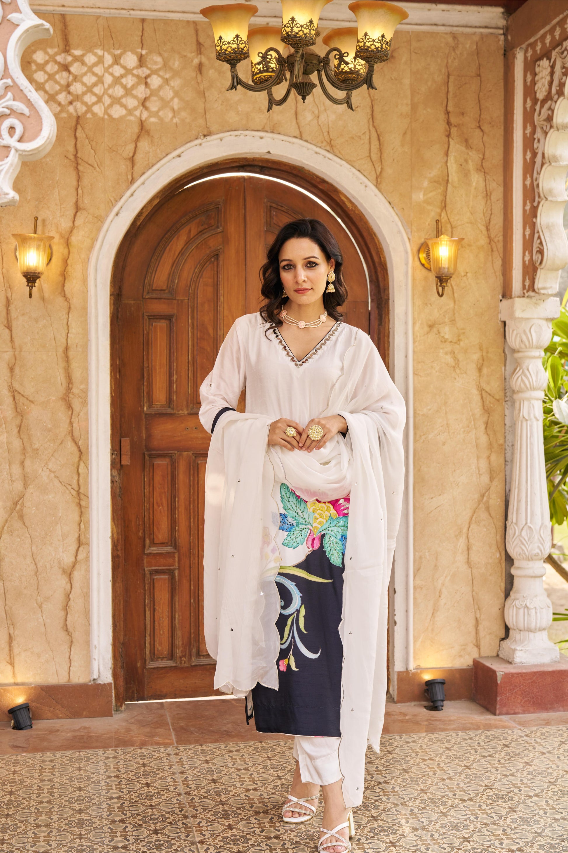 Featuring Shirt Of Muslin Silk With Mirror And Cut Dana Work On Neckline And Front Of Shirt Paired With Modal Pants, Comes With Organza Dupatta With Sequince Work And Scalloped Edges.