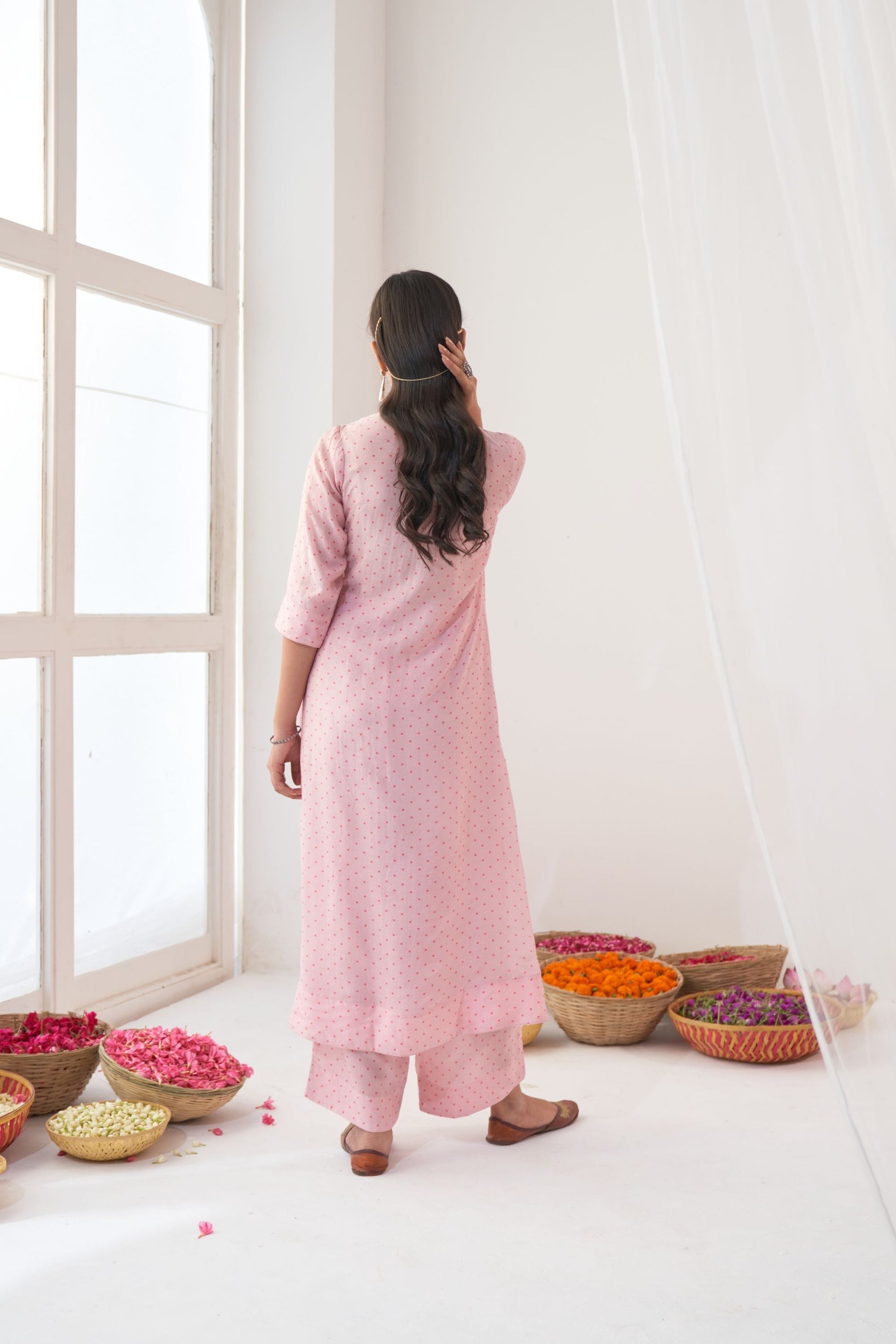 •A-line cotton silk kurta with pin tucks detailing on neckline, teamed with dot printed palazzo.
