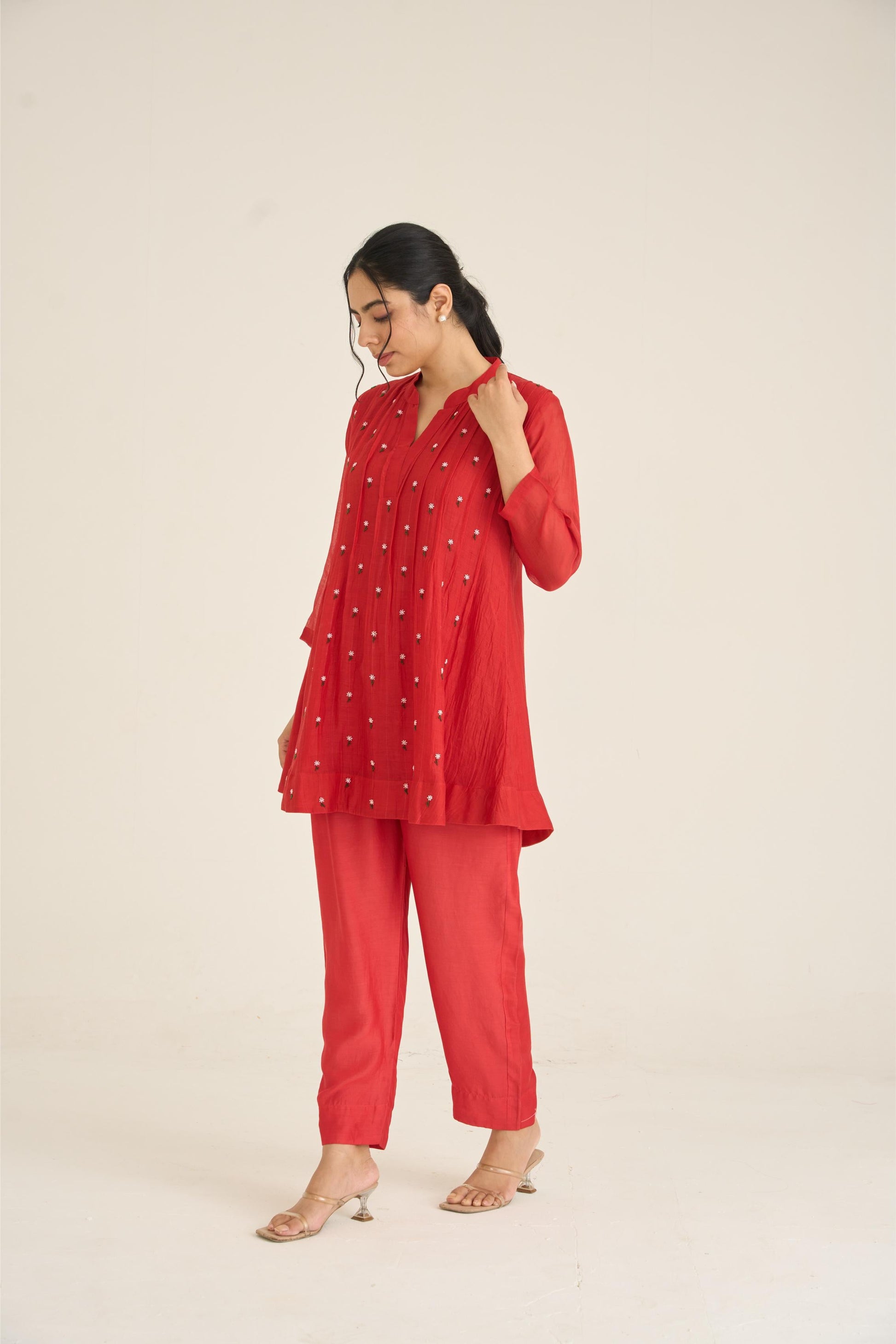 The kurta features a smart V-neckline and relaxed 3/4 sleeves for comfort and style. Paired with matching red straight trousers, this outfit is perfect for casual chic, office wear, or understated festive gatherings.