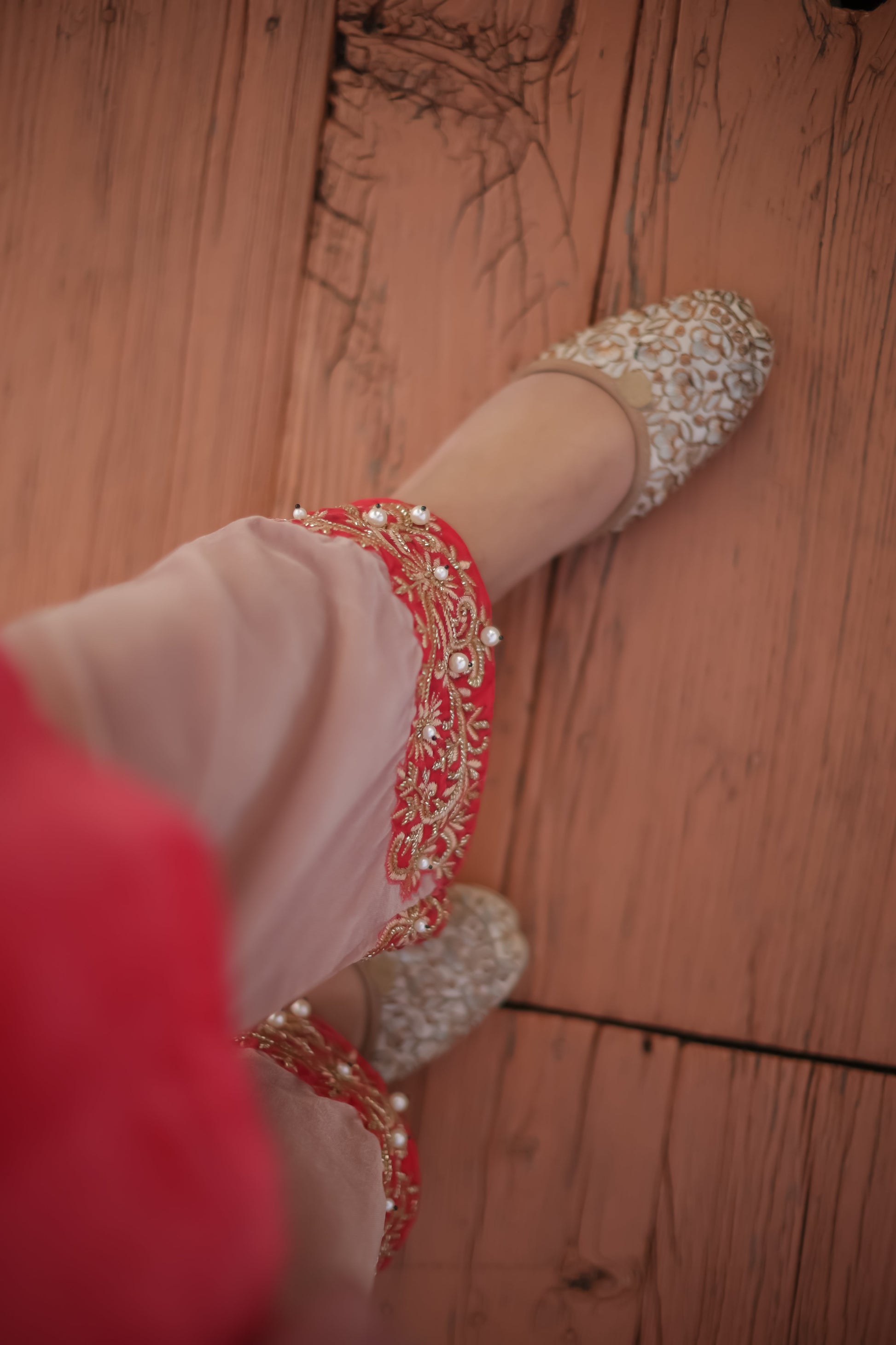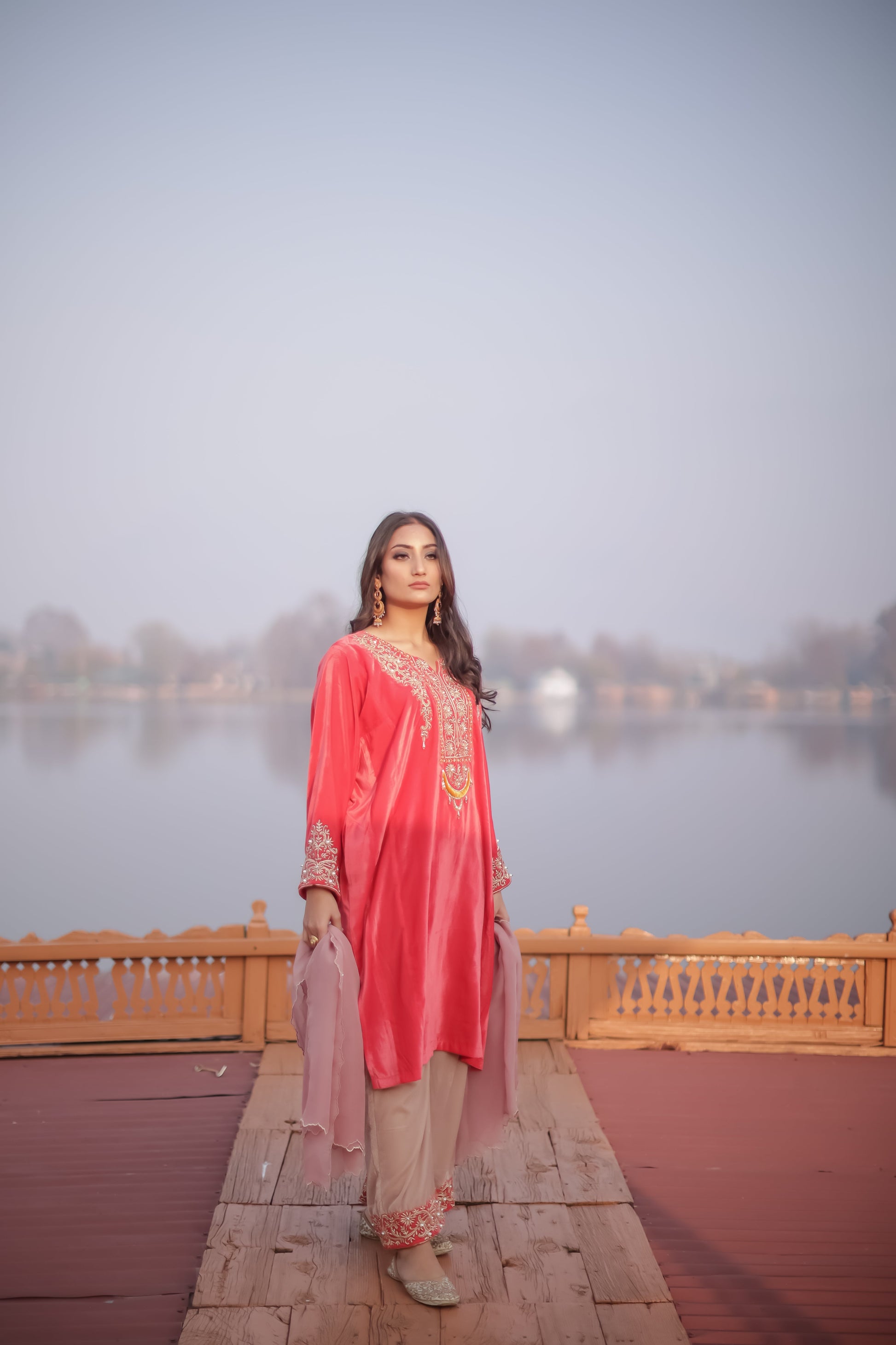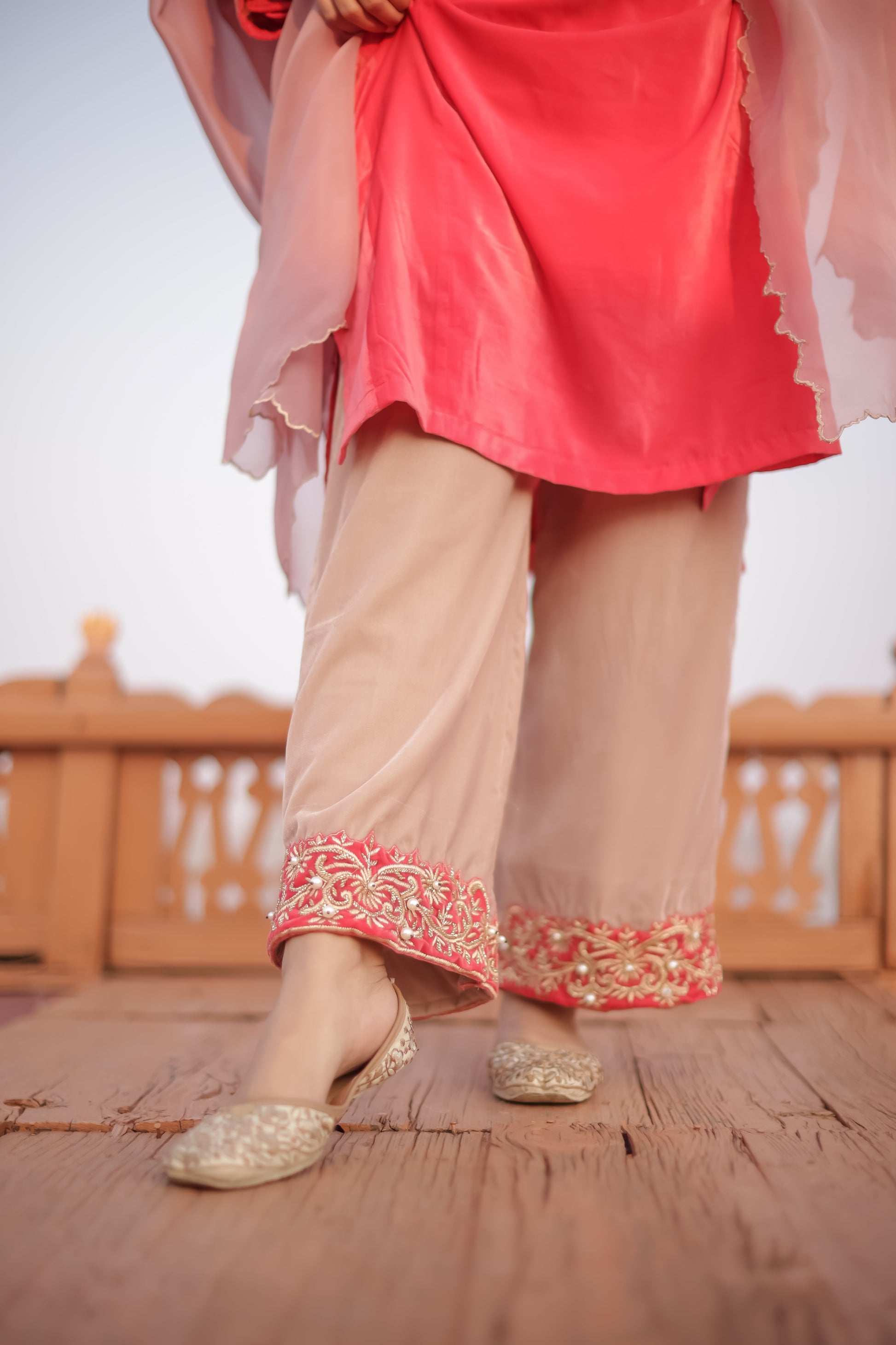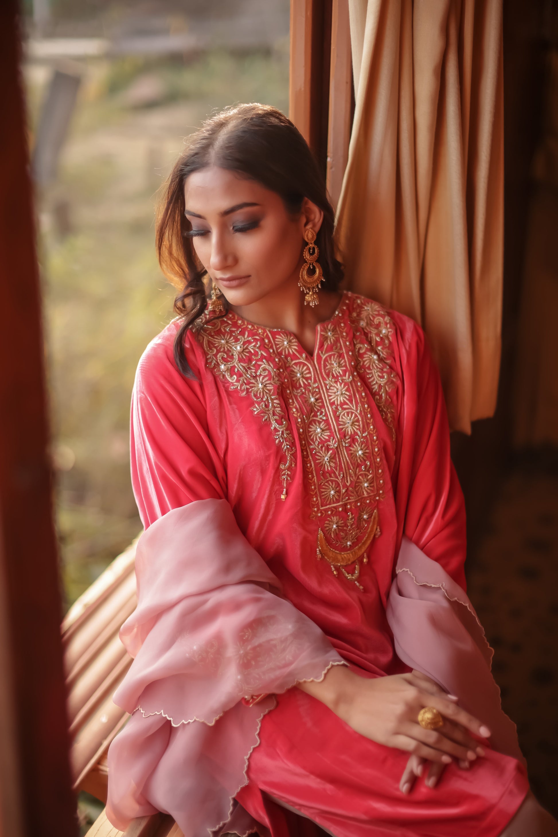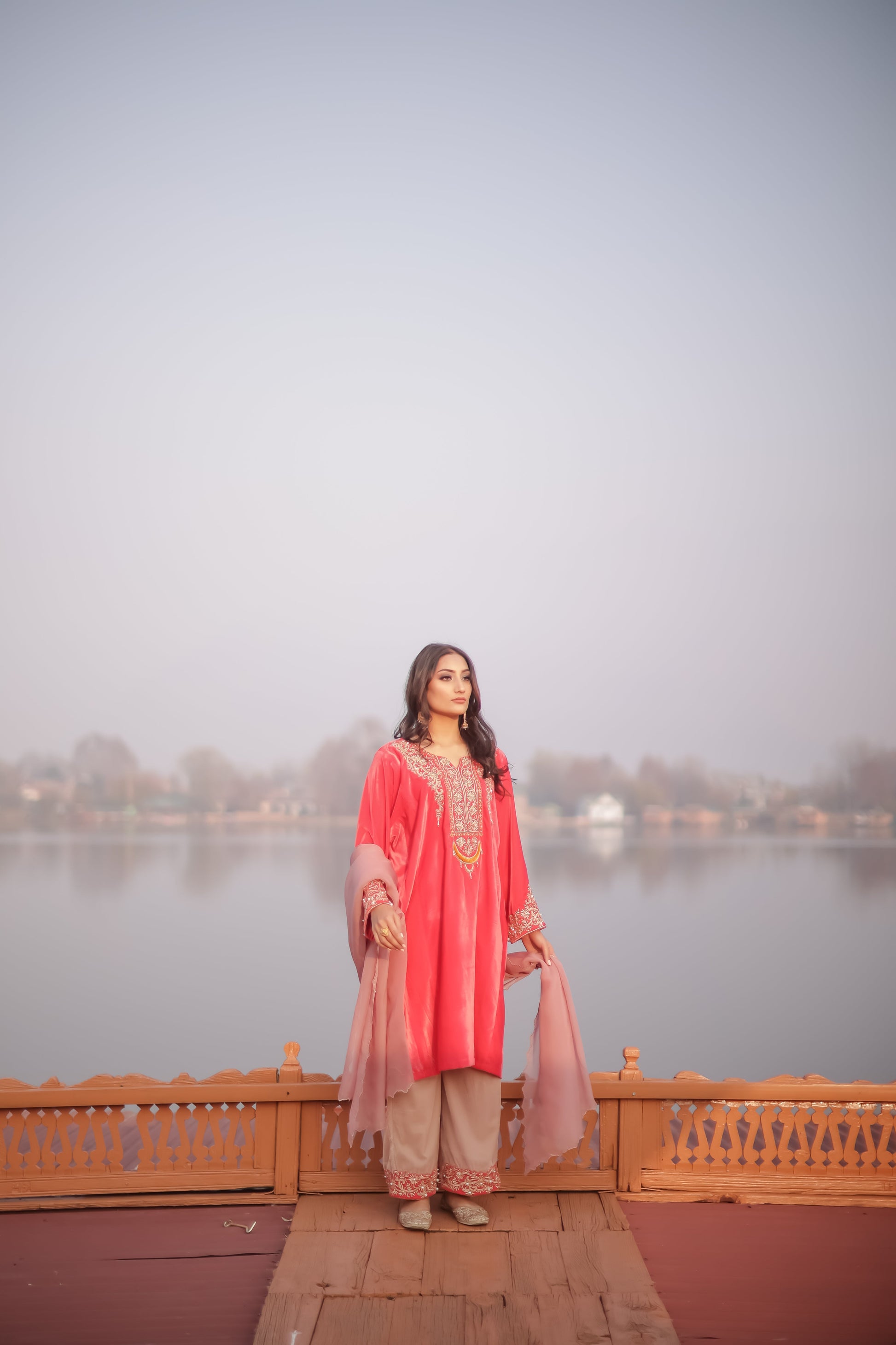 Featuring a scarlet anti fit kurta in velvet with intricate hand embroidered neckline and sleeves paired with with velvet hand embroidered palazzo and scalloped organza dupatta.