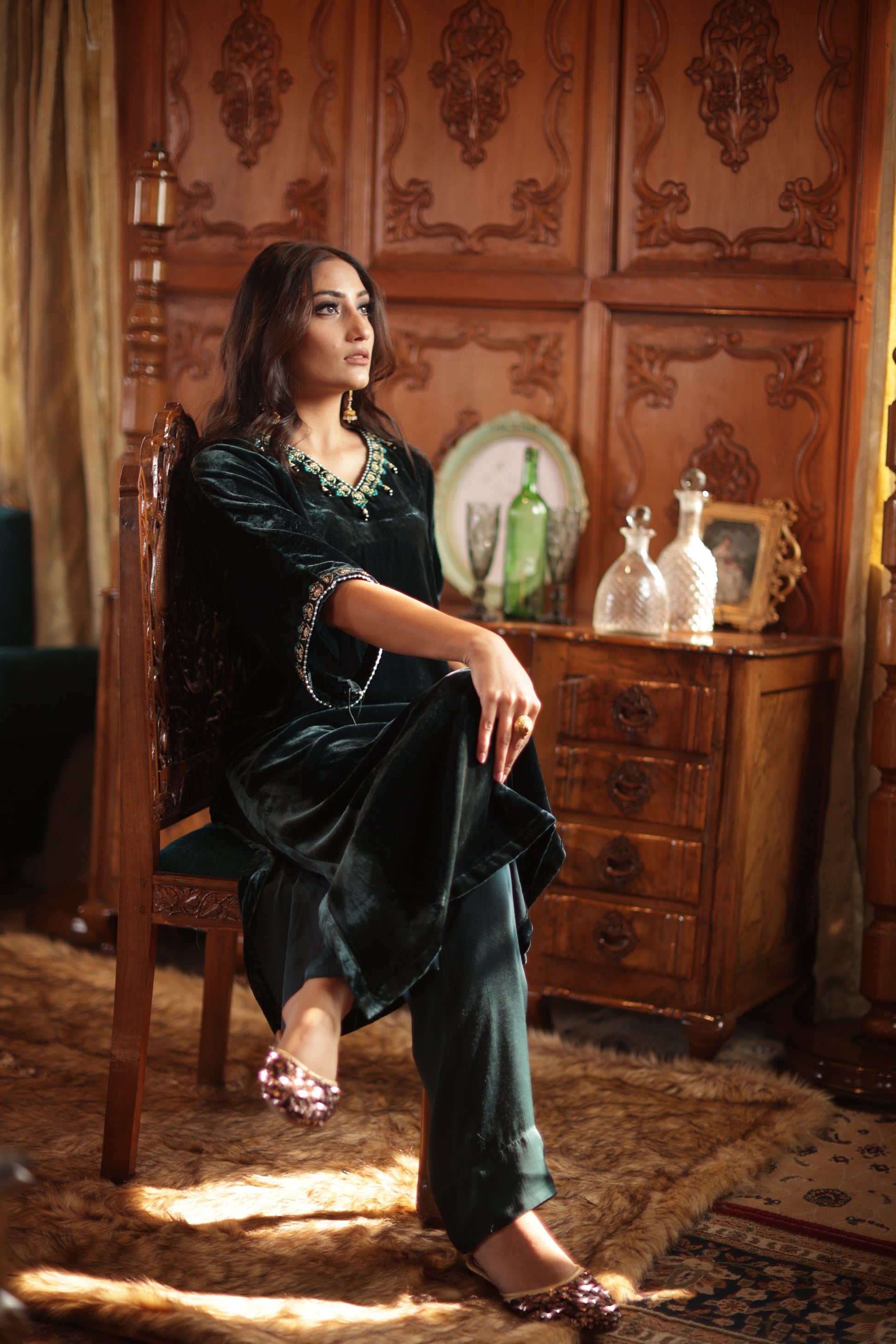 V- neck kaftan with beautiful intricate embroidery in neckline, sleeves and back. Paired with silky modal palazzo.